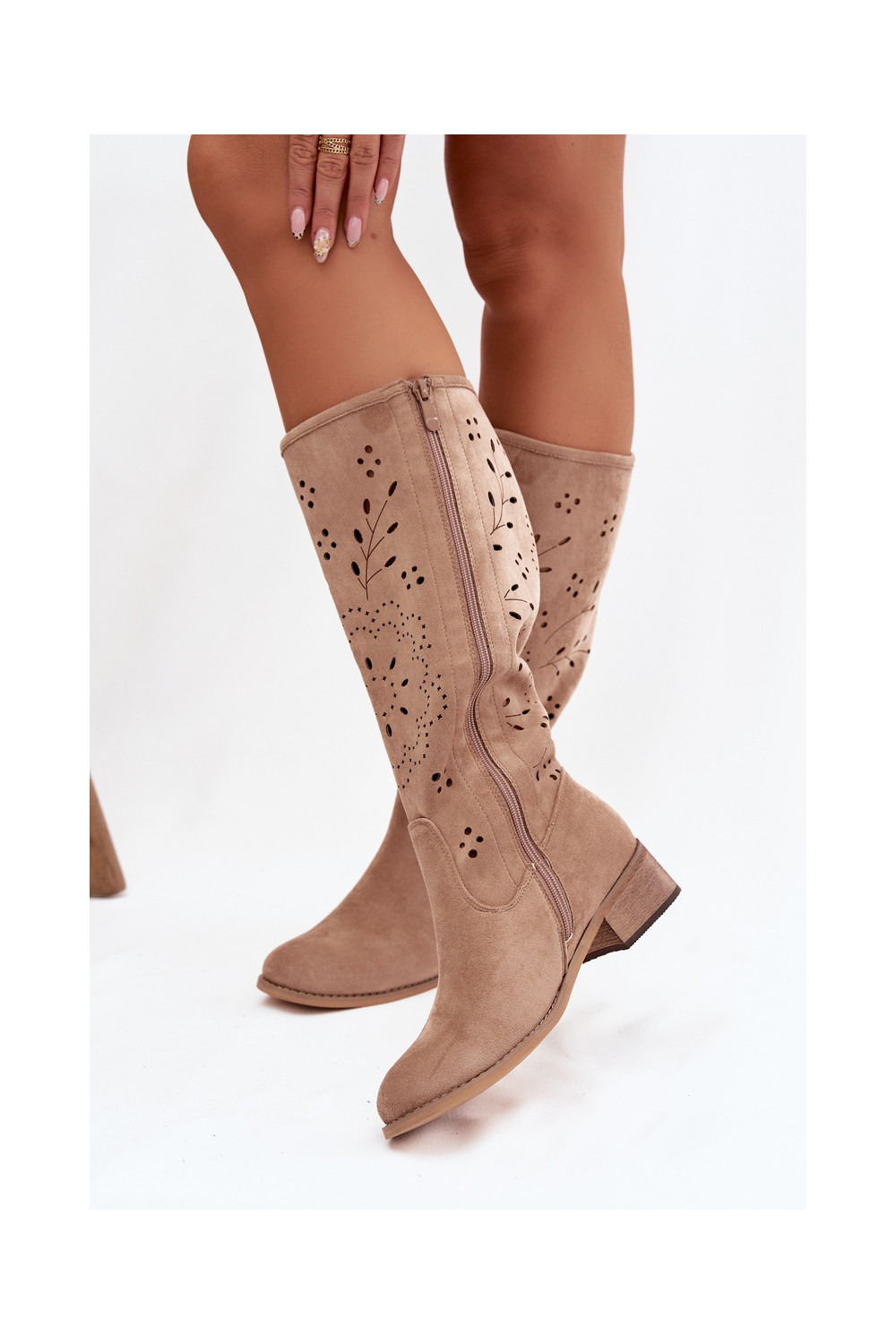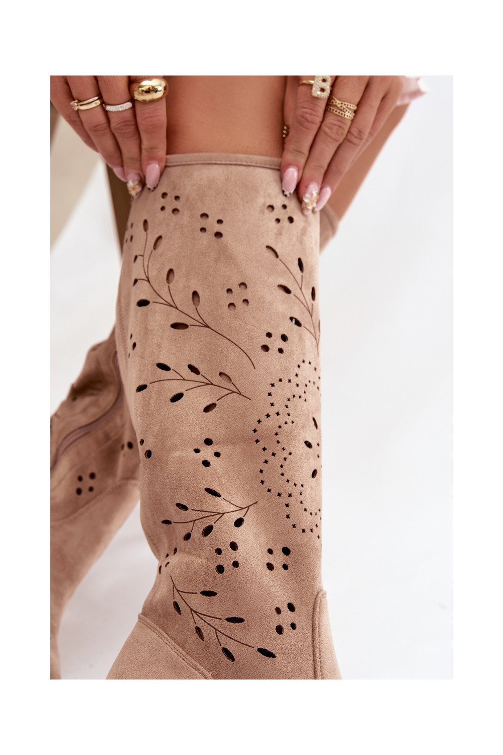 Chaki spalvos moteriški ilgaauliai batai su ažūro elementais Helinna