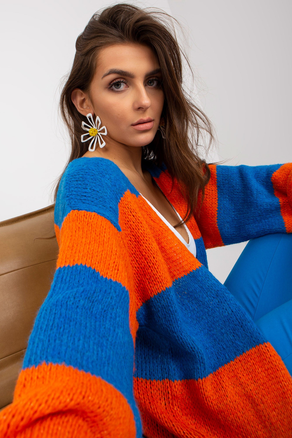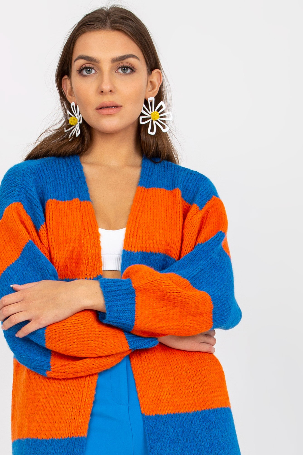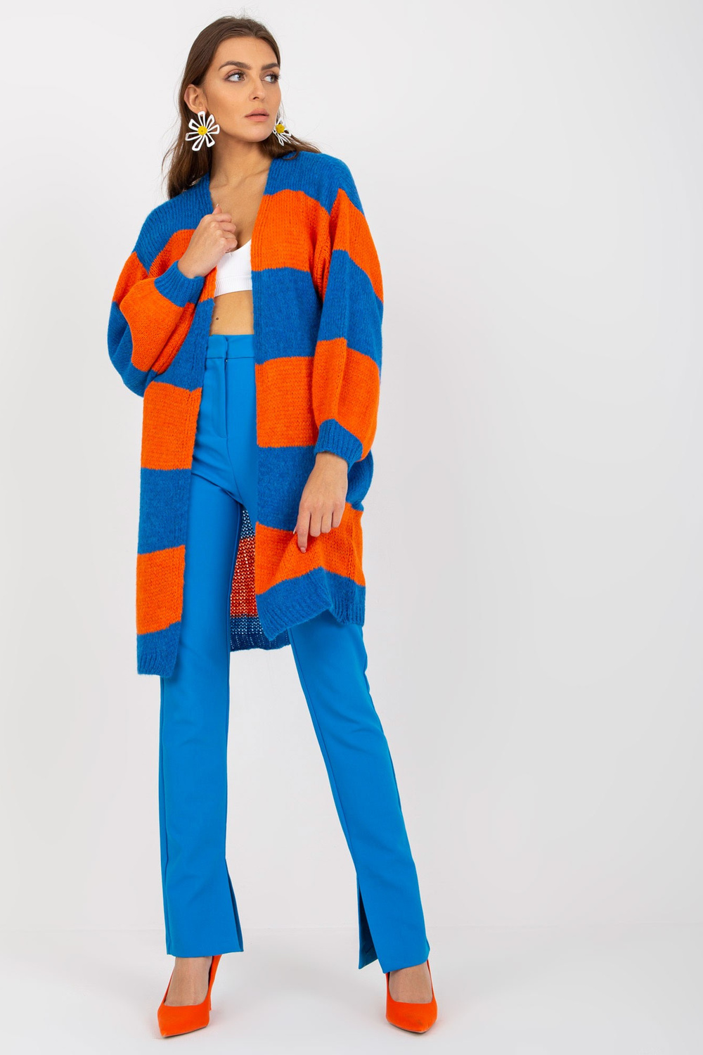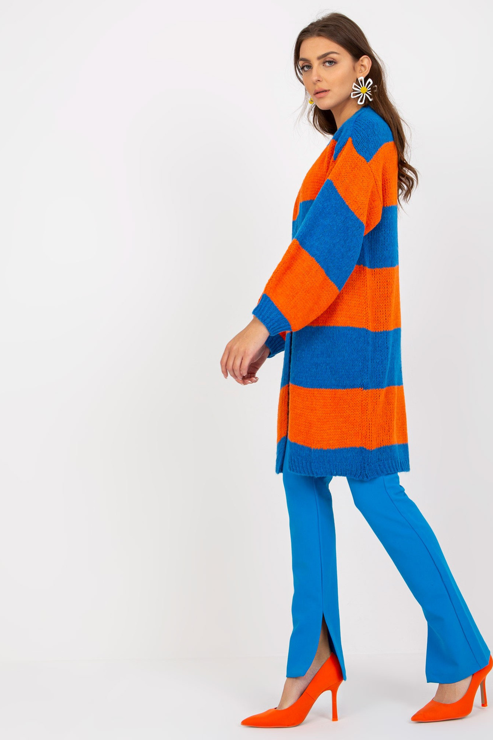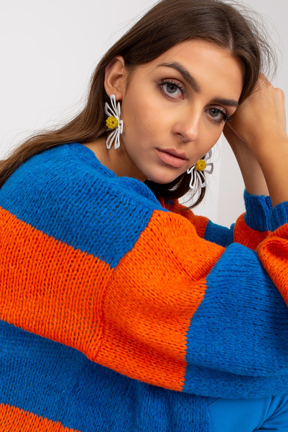 Mėlynos ir oranžinės spalvos moteriškas dryžuotas megztinis OCH BELLA .