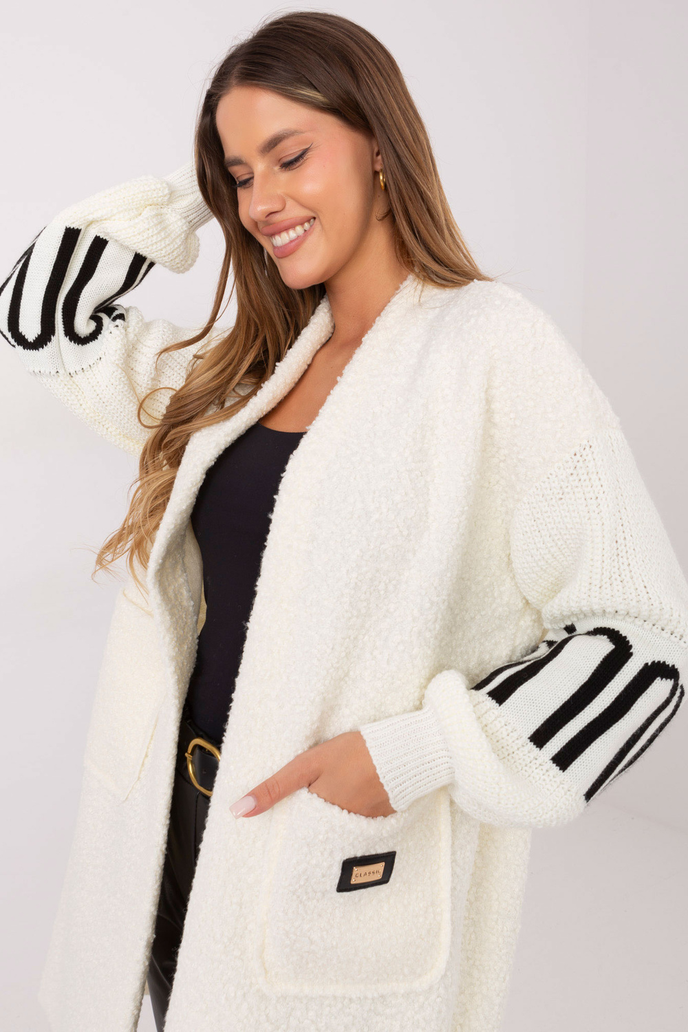 Kardigano matmenys one size dydžio: plotis po pažastimis - 63 cm, bendras ilgis - 98 cm, rankovės ilgis - 55 cm (nuo siūlės), plotis klubų srityje - 68 cm.
