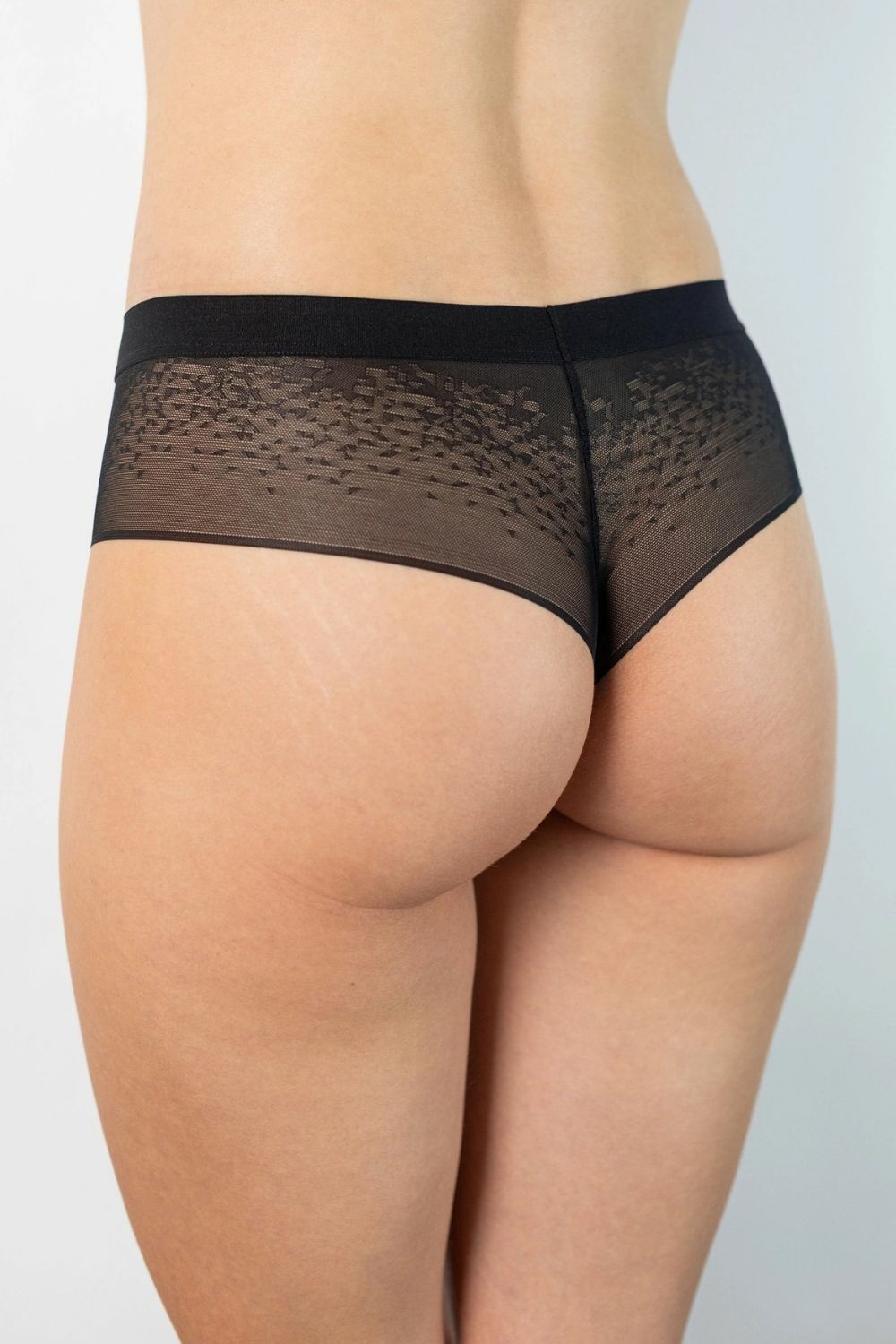Trijų vienetų medvilninių stringų komplektas su nėrinių užpakaliuku. Nėrinių užpakaliukas neleidžia apatinukams matytis pro drabužius. Patogus kirpimas, puikiai tinka kasdieniam dėvėjimui. Juosmuo efektyviai laiko apatinius vietoje. Stringai yra patogūs ir nespaudžia kūno. Įsiūvė pagaminta iš malonios ir saugios medvilnės intymioms vietoms, atitinkančios OEKO-TEX 100 % standartą, pagaminta iš Lenkijos siūlų. Apatiniai sukurti ir pasiūti Lenkijoje.