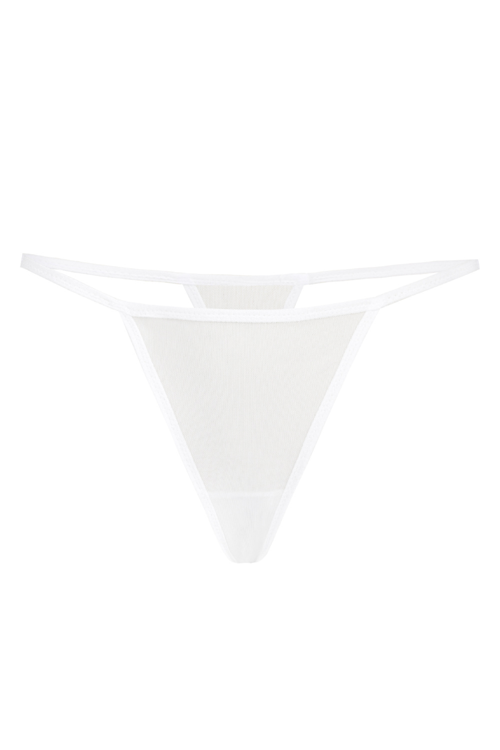Women's sexy white thongs. They are made of transparent thin, pleasant to the touch fine mesh, which is lined with delicate cotton absorbing moisture and ensuring freshness and comfort during use. At the back of the thongs, there is a tiny triangle, which is an extension of a thin strip that hides between the buttocks. Stringais completely expose the buttocks and please the male eye. The whole thong, front and back, is finished with a thin elastic strap. Stringais are very skimpy yet simple in cut, without any decorations, bows, lace, or decorative sequins. They are adsuknelėed to women who value simplicity. Stringais combined with a sexy shirt made of the same thin transparent mesh combined with lace and tightly fitted to the body create an impressive set that will ignite the atmosphere in the bedroom. Stringais are a perfect gift for your loved one. Washed at the right temperature, they maintain a long lifespan and do not change color. Every woman should have such sexy, red thongs in her wardrobe for special occasions.