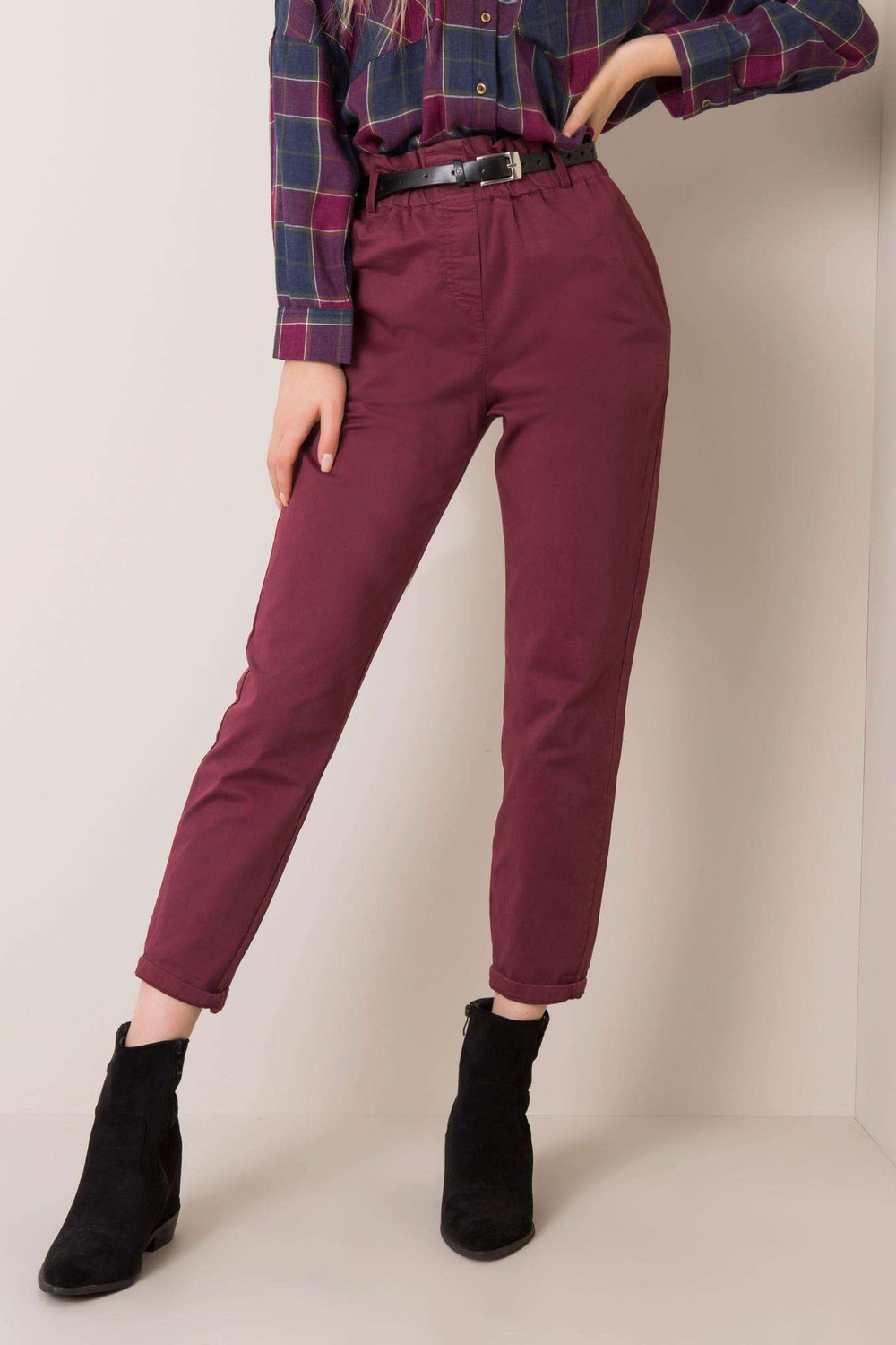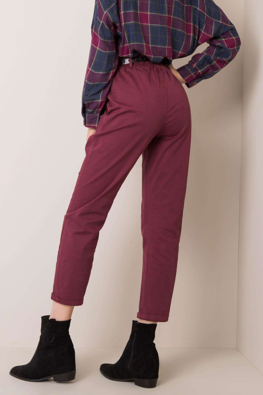 Cassie kaštoninės spalvos kelnės. priedai: diržas, elastinė juosta ties juosmeniu medžiagasudėtis: 95% medvilnė, 5% elastanas skalbimo būdas: skalbimas mašinoje 30°C. Modelis dėvi S dydį. Matmenys modelio: ūgis 175 cm, krūtinė 84 cm, juosmuo 60 cm, klubai 90 cm.