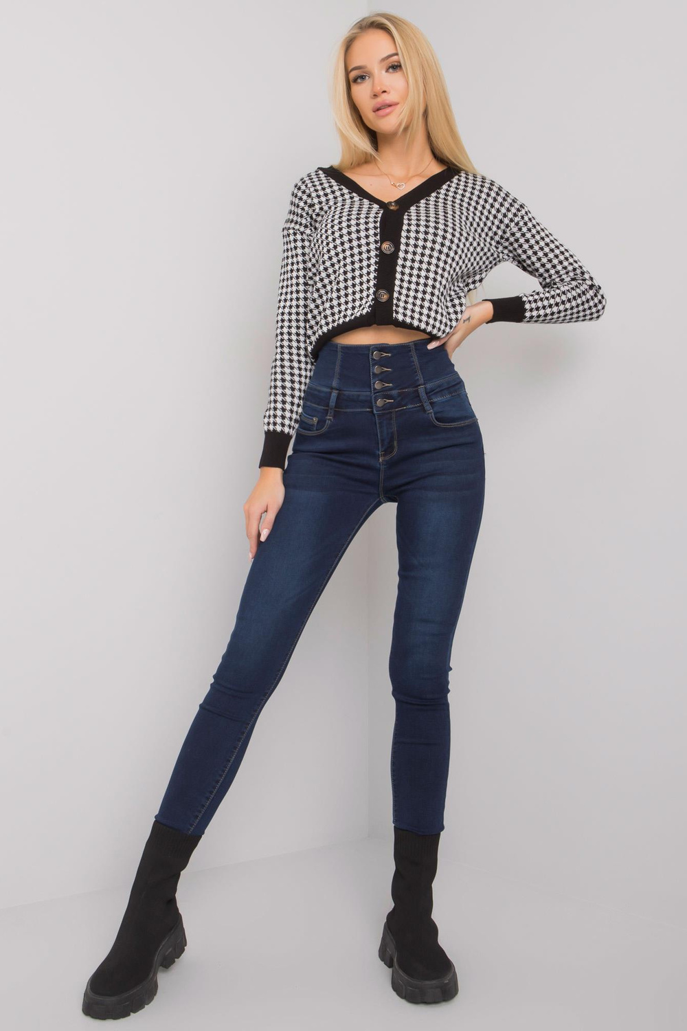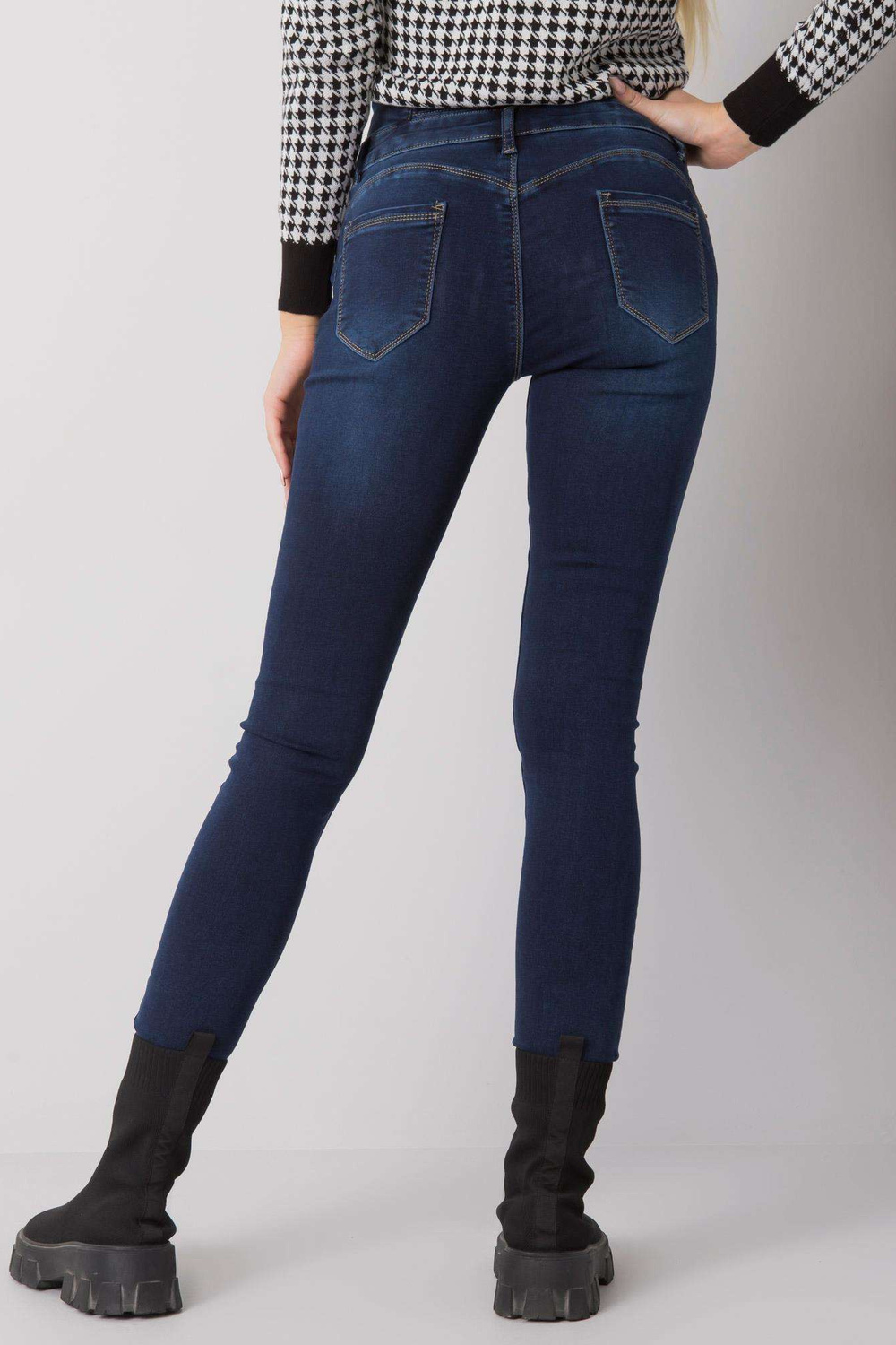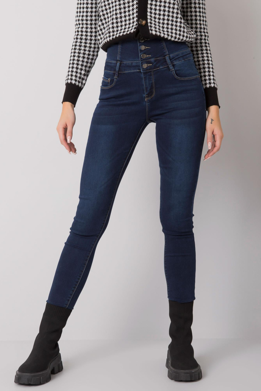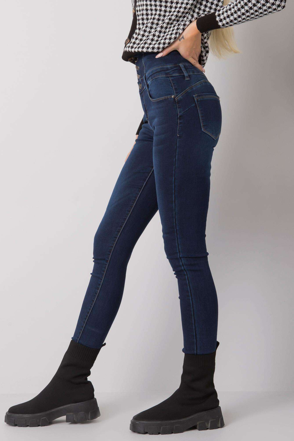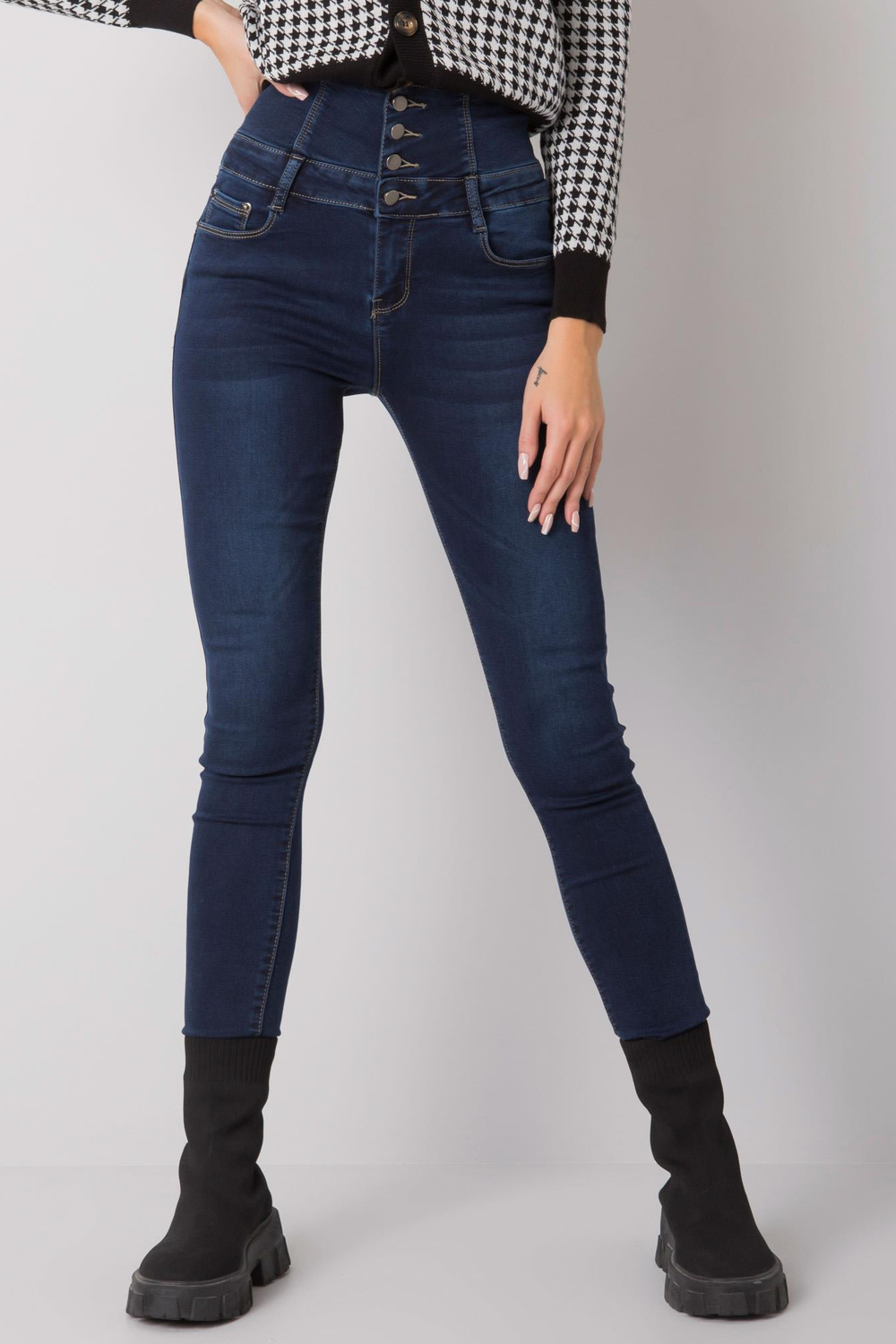 Tamsiai mėlyni džinsai su vamzdeliais aukštu juosmeniu. medžiagos sudėtis: 64% medvilnė, 34% viskozė, 2% elastanas skalbimo būdas: skalbimo mašina 30°C. Modelis dėvi S dydį. Modelio išmatavimai: aukštis 175 cm, krūtinė 84 cm, juosmuo 62 cm, klubai 93 cm . Matmenys