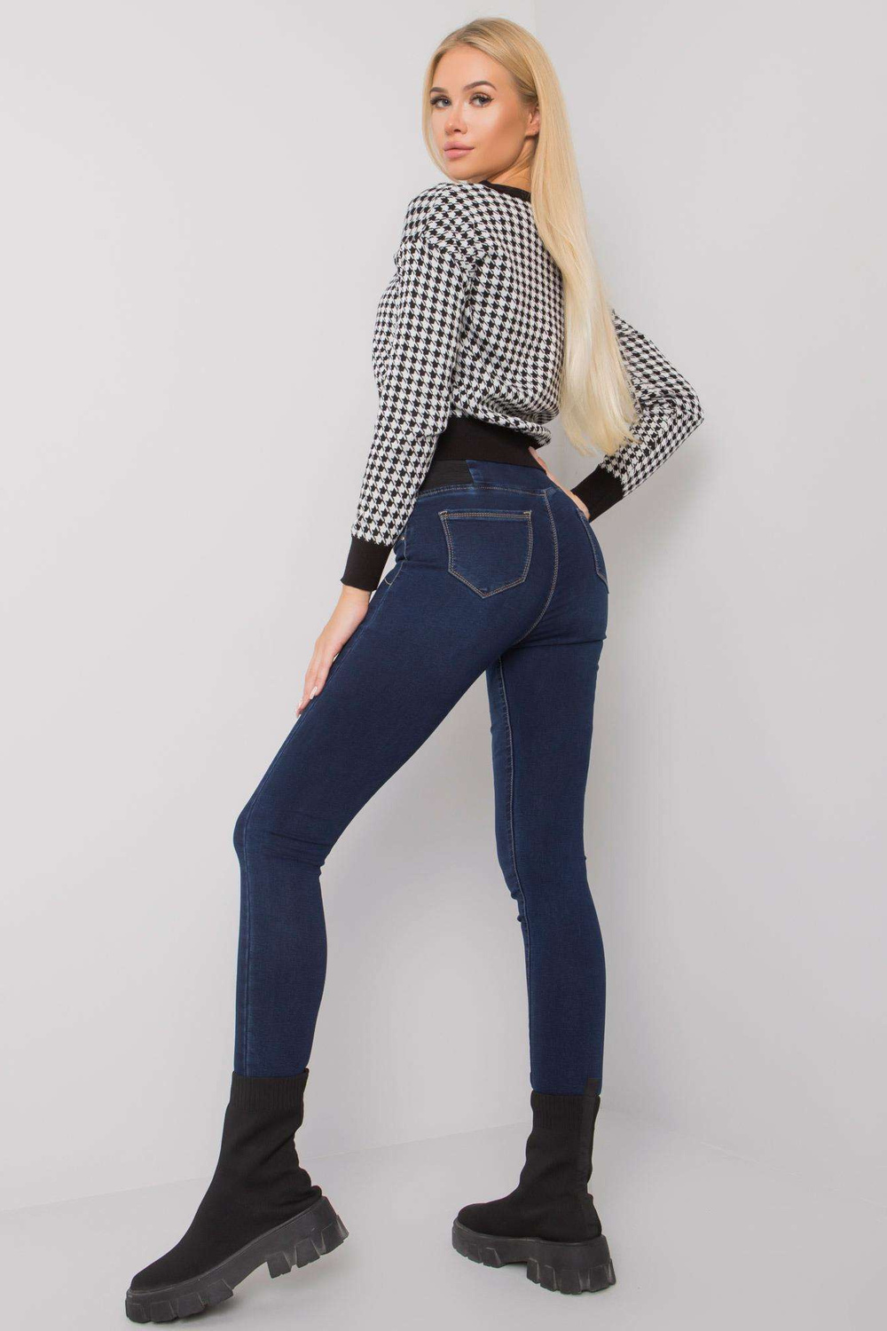 Tamsiai mėlyni pavasariniai džinsai aukštu juosmeniu.