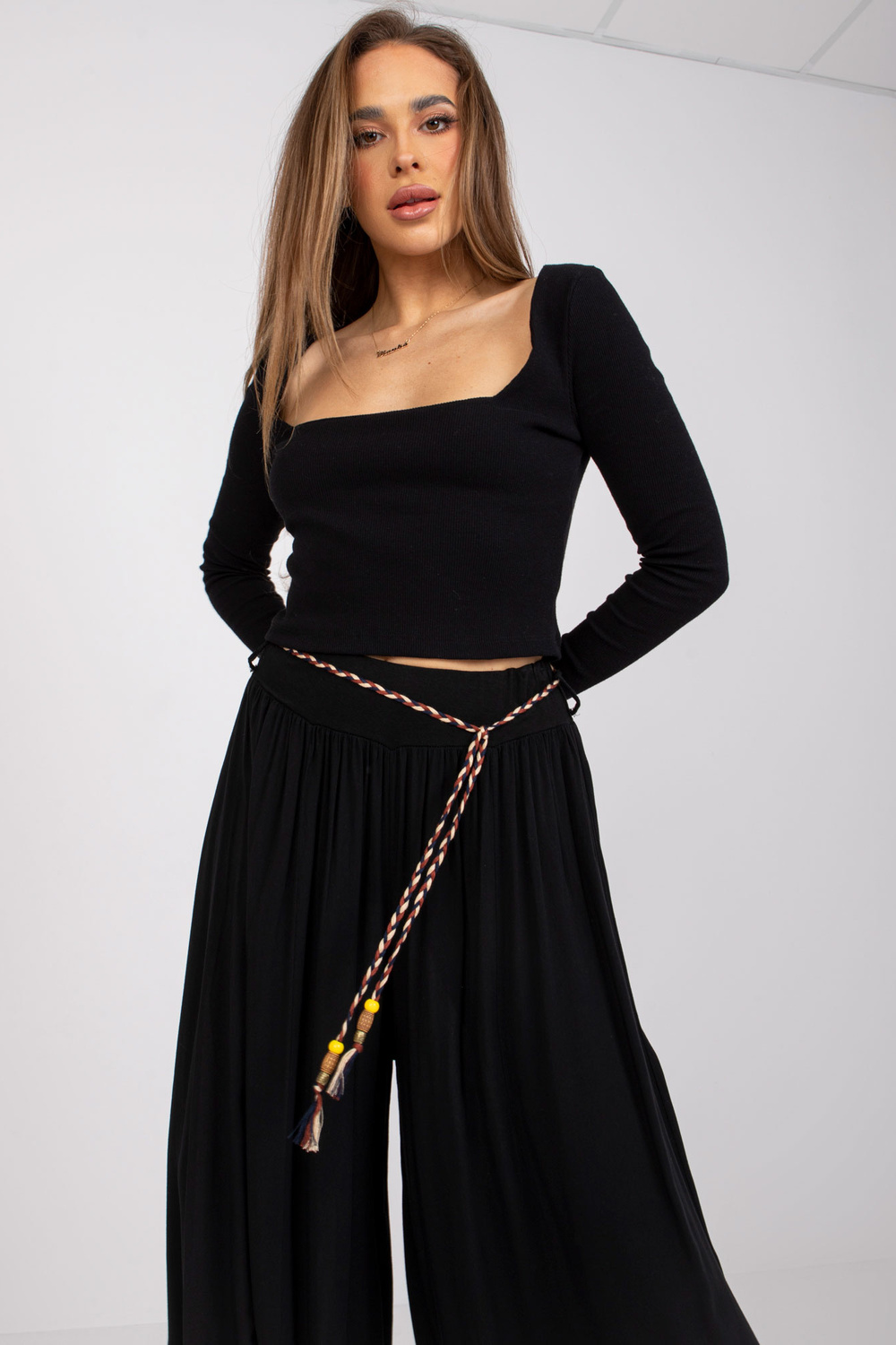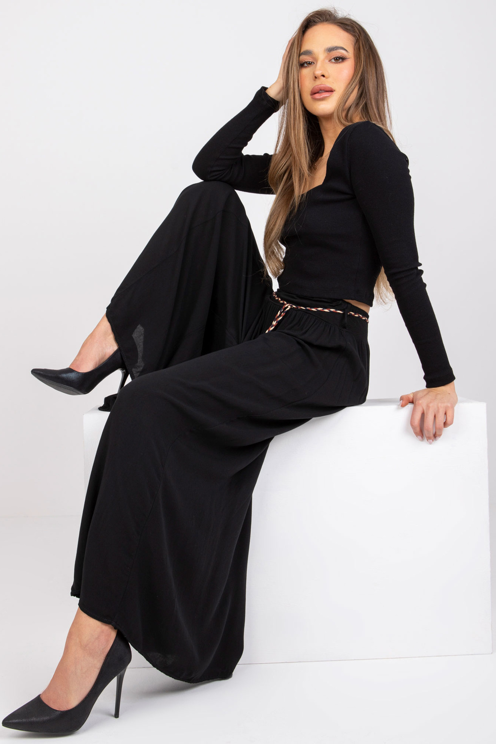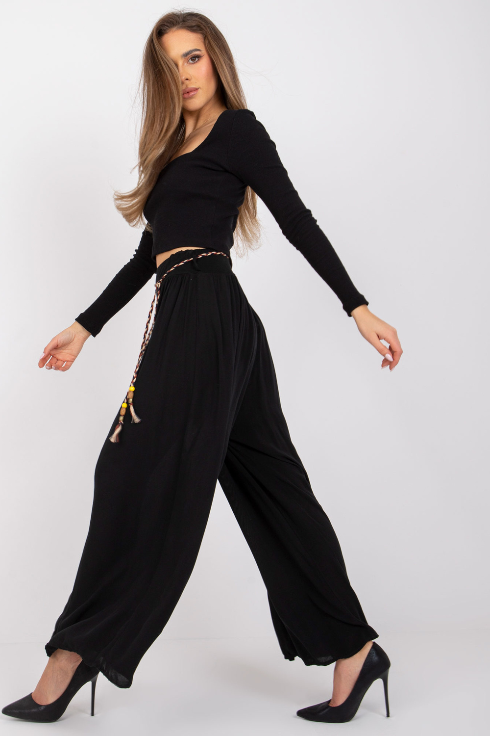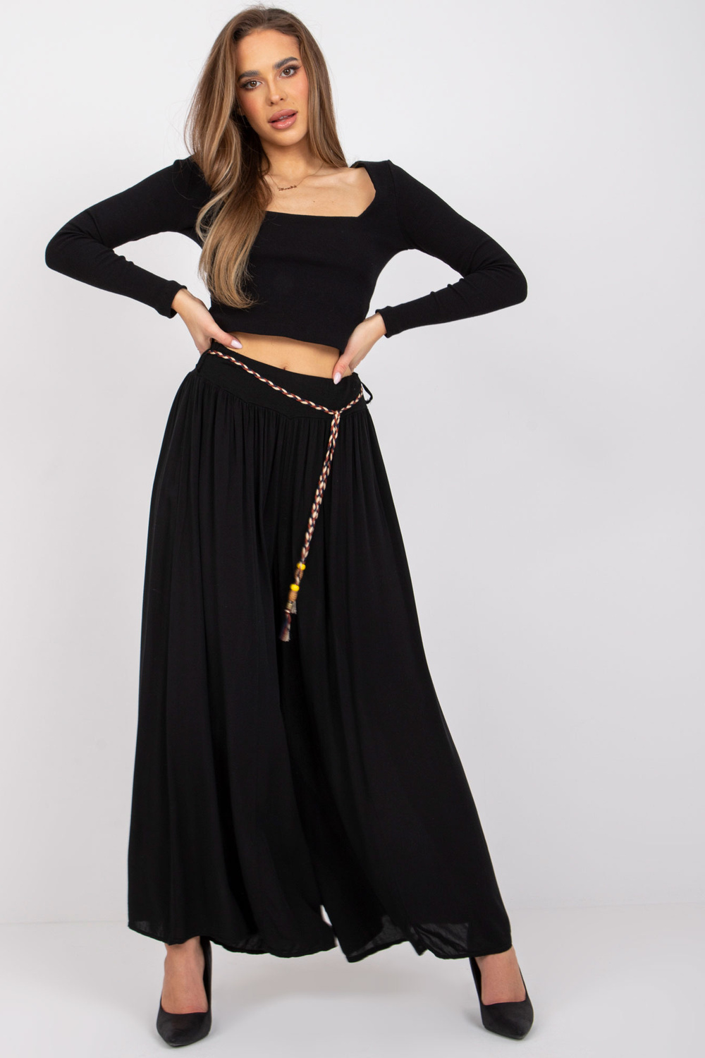 Juodos kelnės moterims palazzo Surie OCH BELLA . priedai: diržas, elastinė juosta ties juosmeniu medžiagasudėtis: 100% viskozė skalbimo būdas: skalbimas mašinoje 30°C Gaminio kodas: TW-SP-BI-81733.14 dominuojantis raštas: be rašto Stilius: kasdienis, boho progai: cas