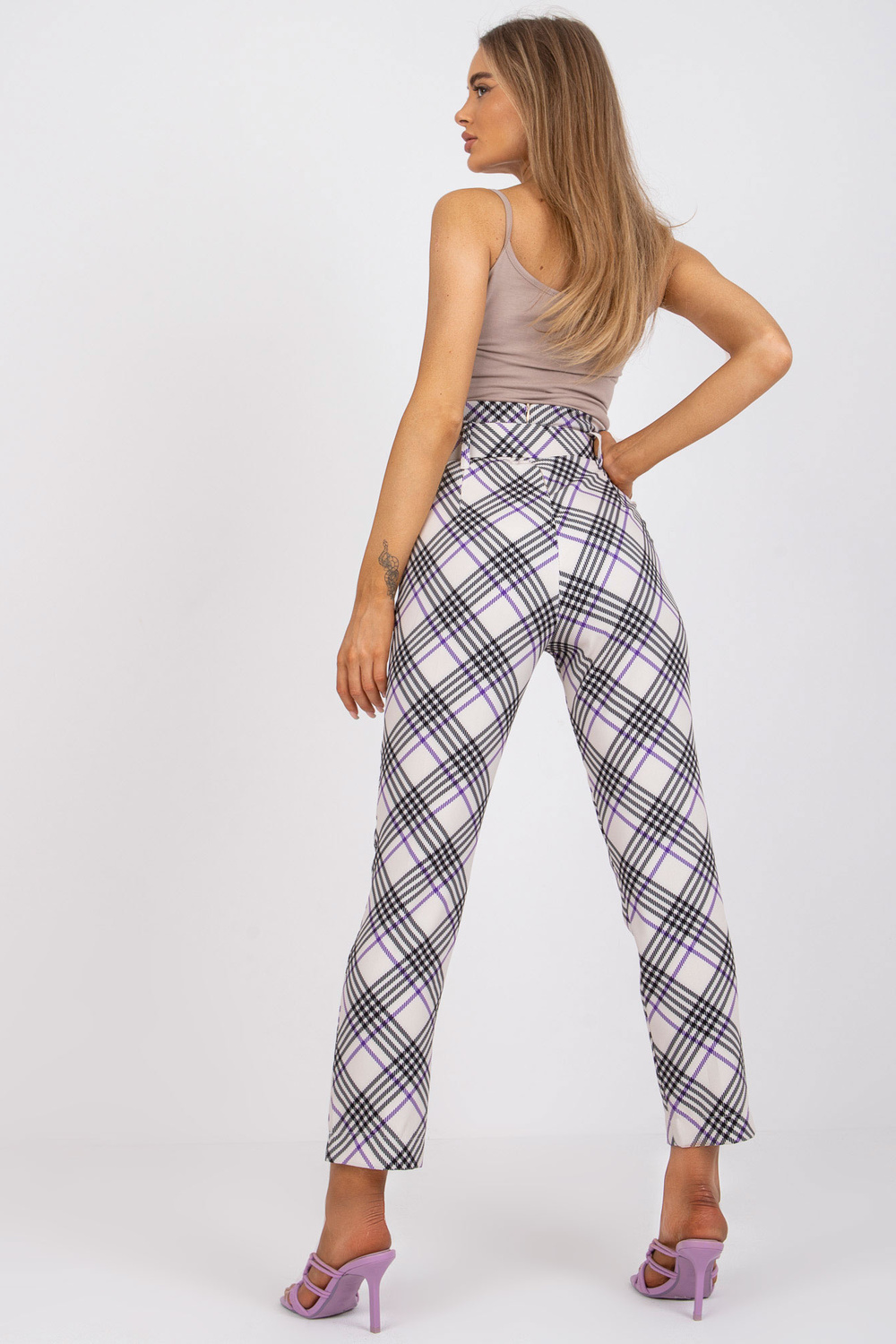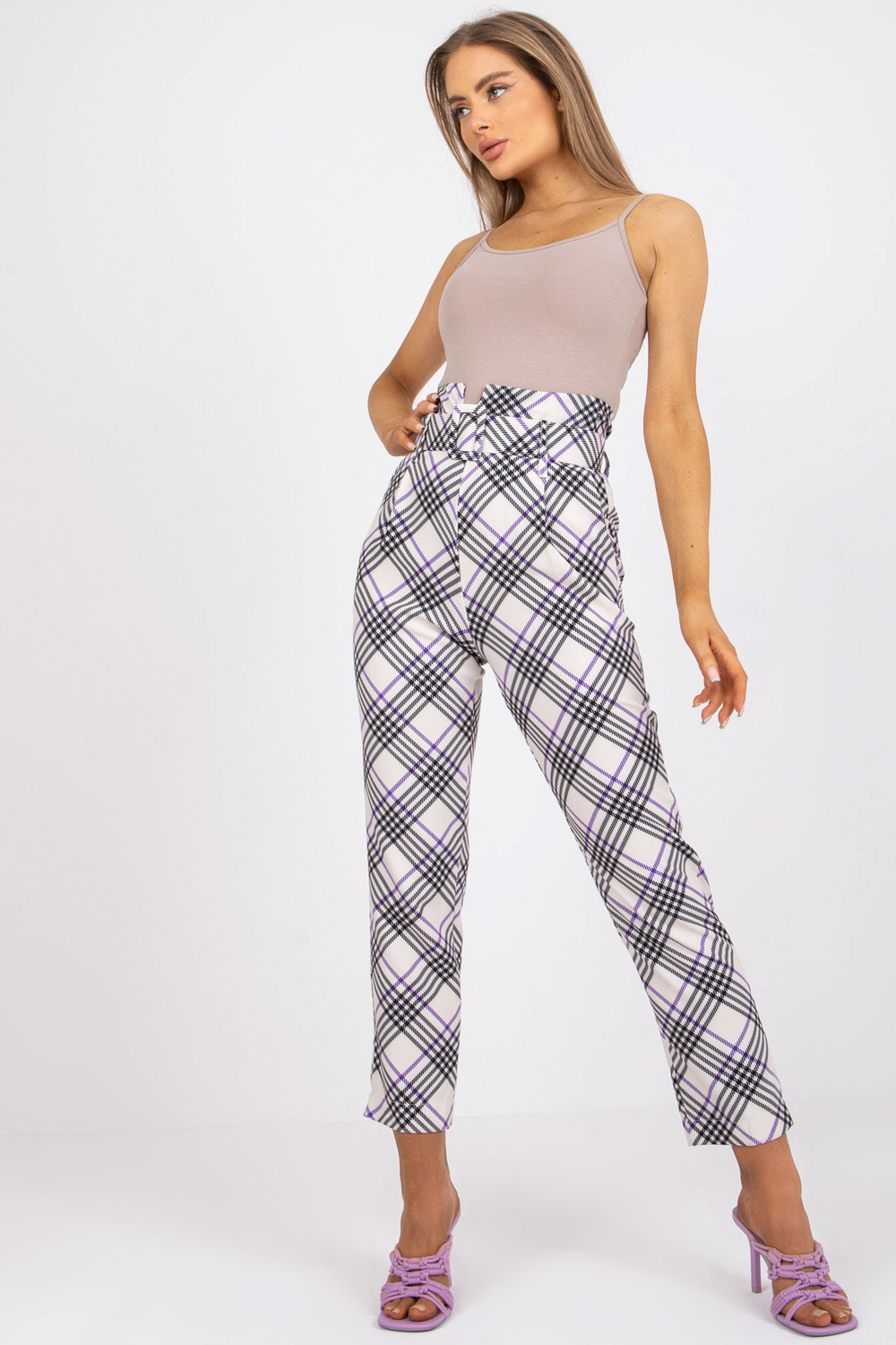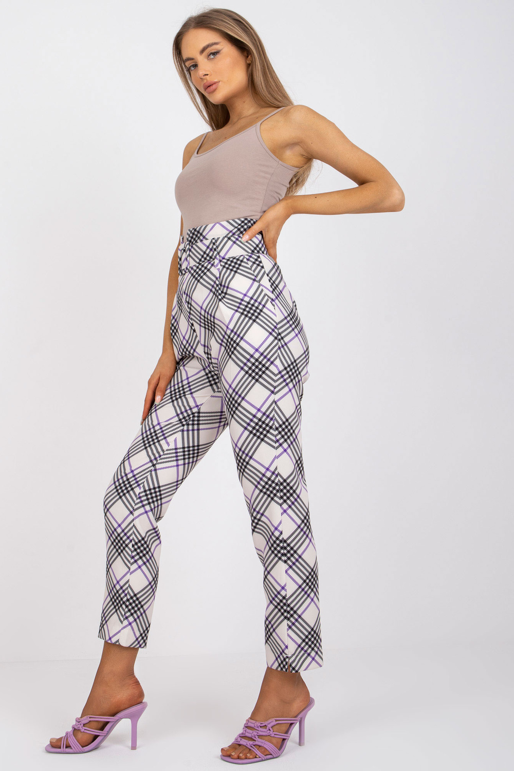 Ecru-violetinės spalvos moteriškos kostiuminės kelnės.