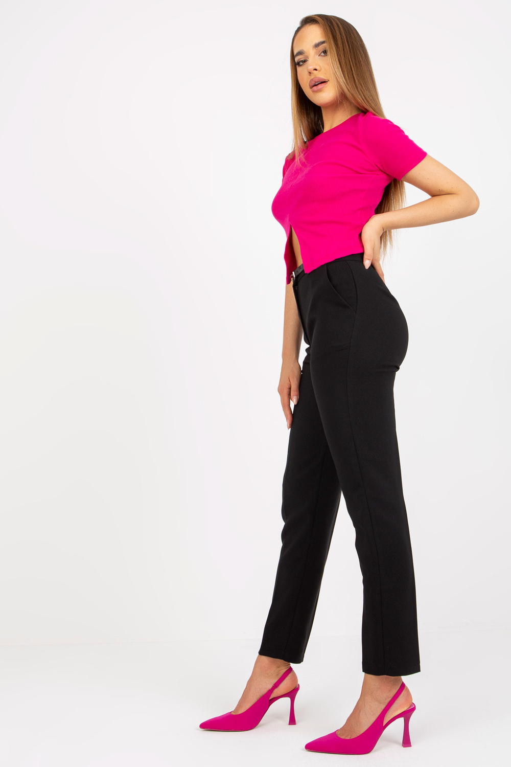 Juodos spalvos audinio kelnės su kišenėmis. aksesuarai: dirželis, šoninės kišenės, prisiūtos galinės kišenės medžiagasudėtis: 65% poliesteris, 35% viskozė skalbimo būdas: skalbimas mašinoje 30°C Gaminio kodas: BR-SP-102.57 dominuojantis raštas: lygus Stilius: Elegantiška Proga: ca