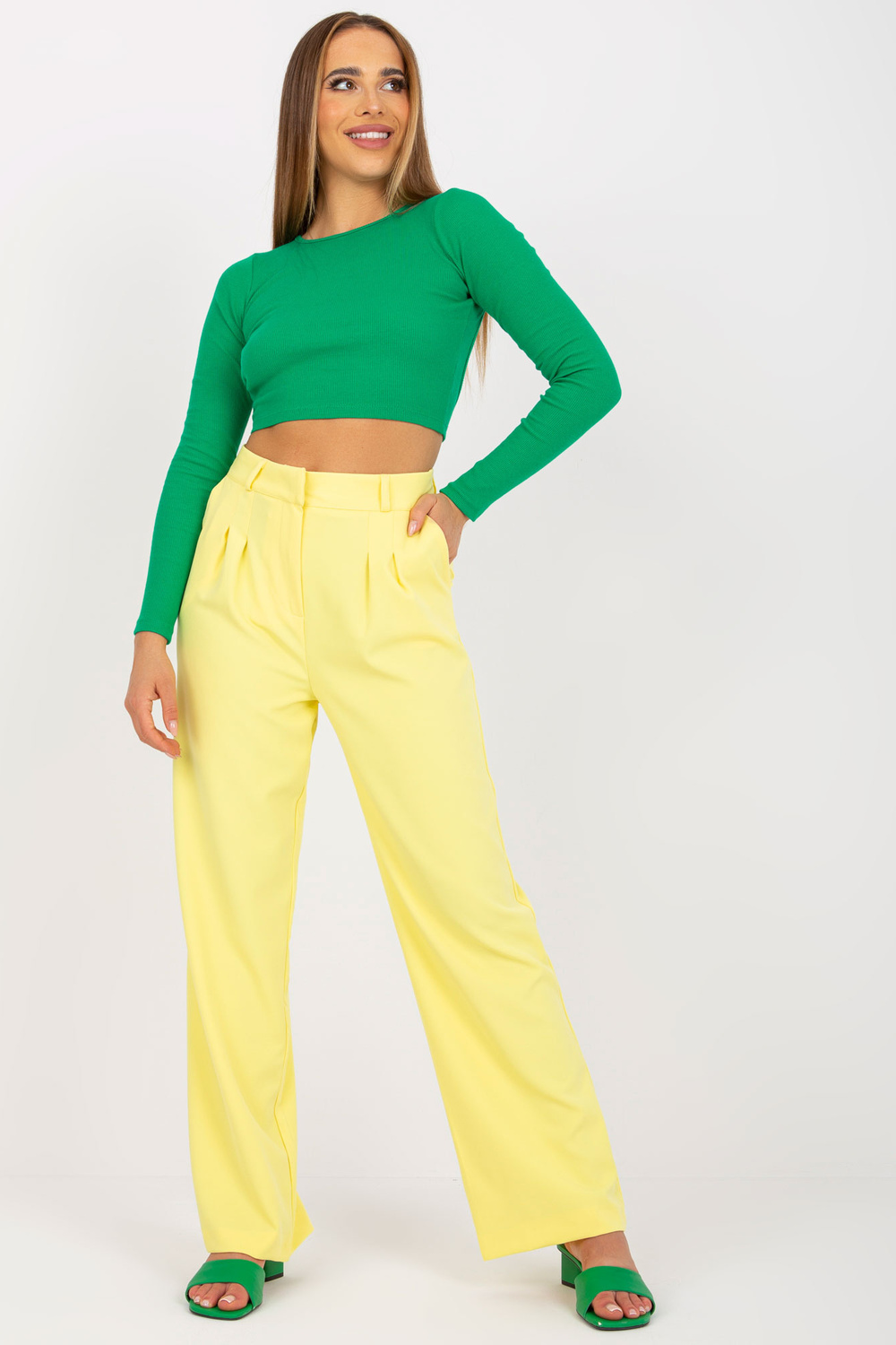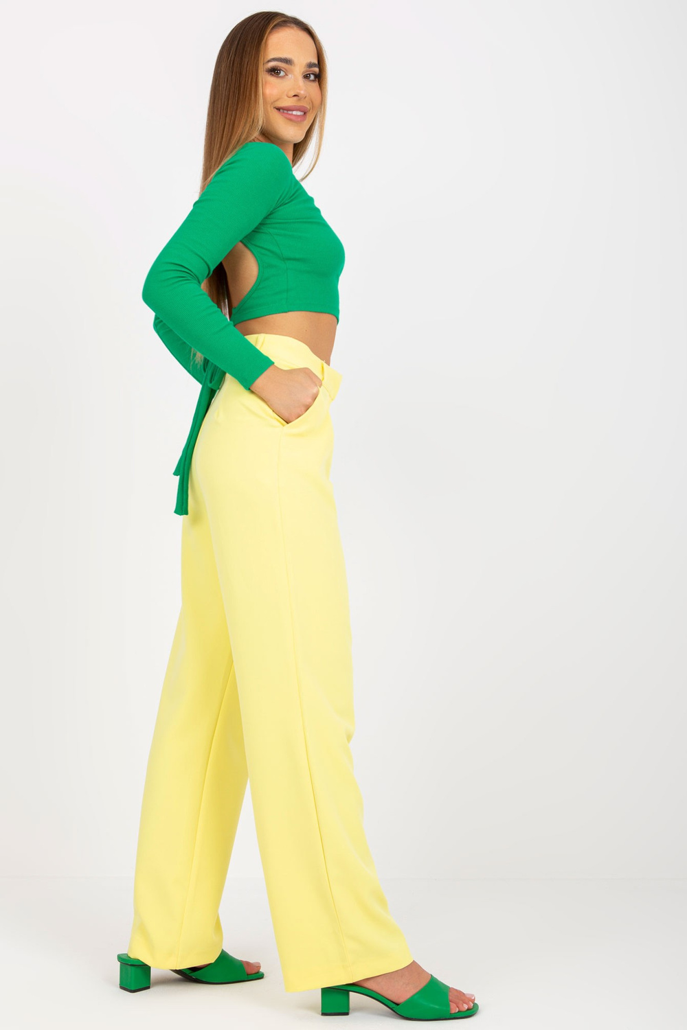 Šviesiai geltonos kelnės iš audinio su kišenėmis RUE PARIS . medžiagos sudėtis: 88% poliesteris, 12% elastanas skalbimo būdas: skalbimas mašinoje 30°C Gaminio kodas: TO-SP-18155.21P dominuojantis raštas: lygus Stilius: laisvalaikio galimybė: dirbti kasdien, už