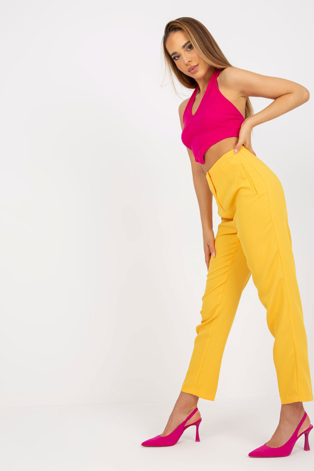 Tamsiai geltonos spalvos moteriškos cigarečių kelnės aukštu juosmeniu.