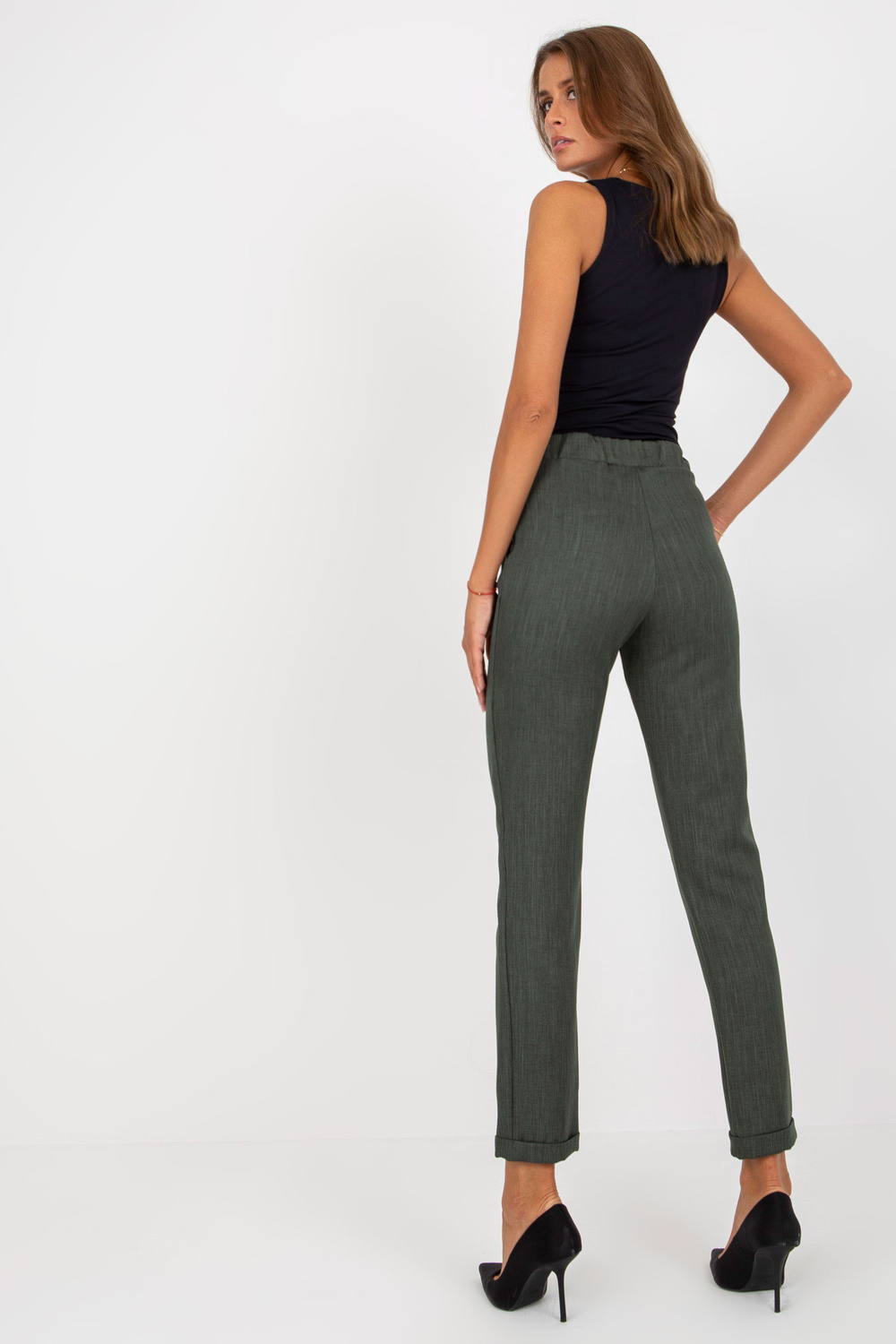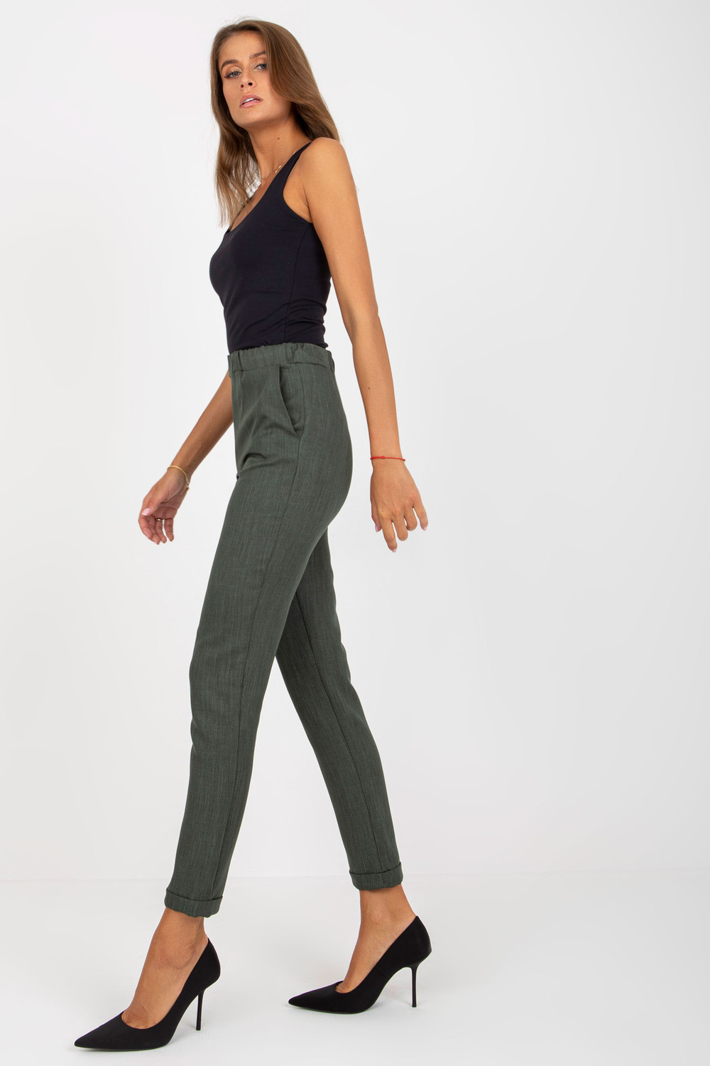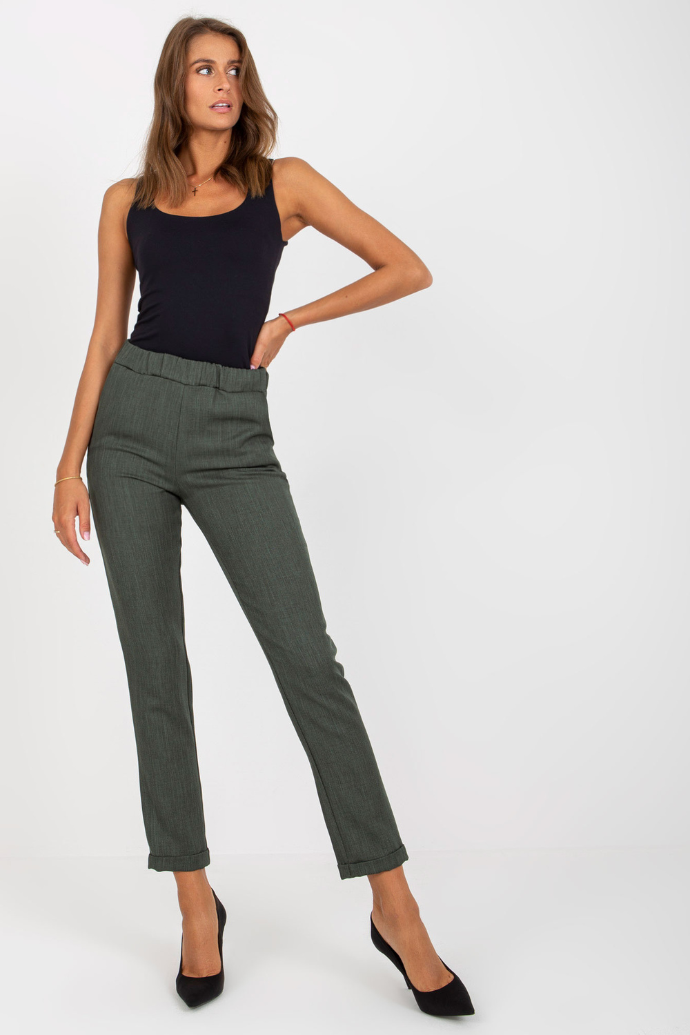Khakimoteriškos kelnės su kišenėmis.