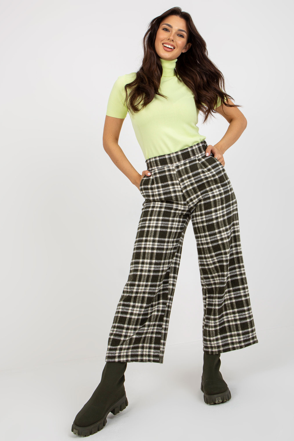 Khakifarbene weite Hose aus stoff karjera. Produkto kodas: LK-SP-509097-2.35P dominantes Muster: Rankgitter Stil: lässig Anlass: lässig, in der Stadt, spazieren gehen, arbeiten Modelis Größe 36. Maße des Models: Höhe 164 cm, Hüllef 86 cm, Taillef 86 cm 99