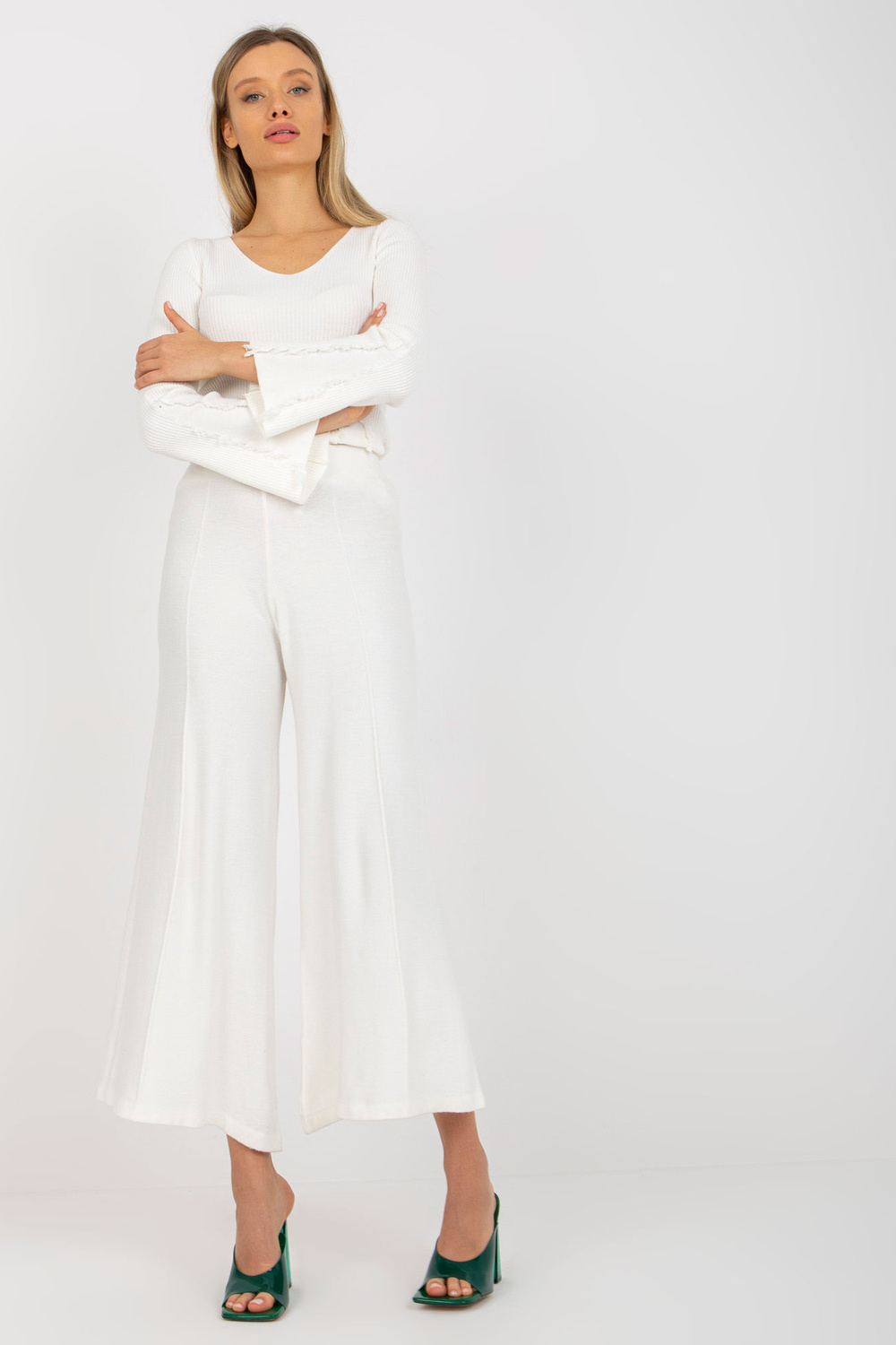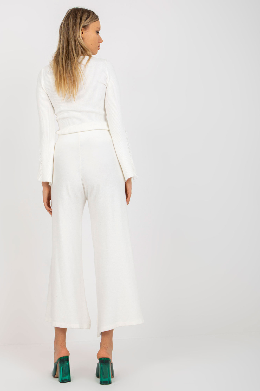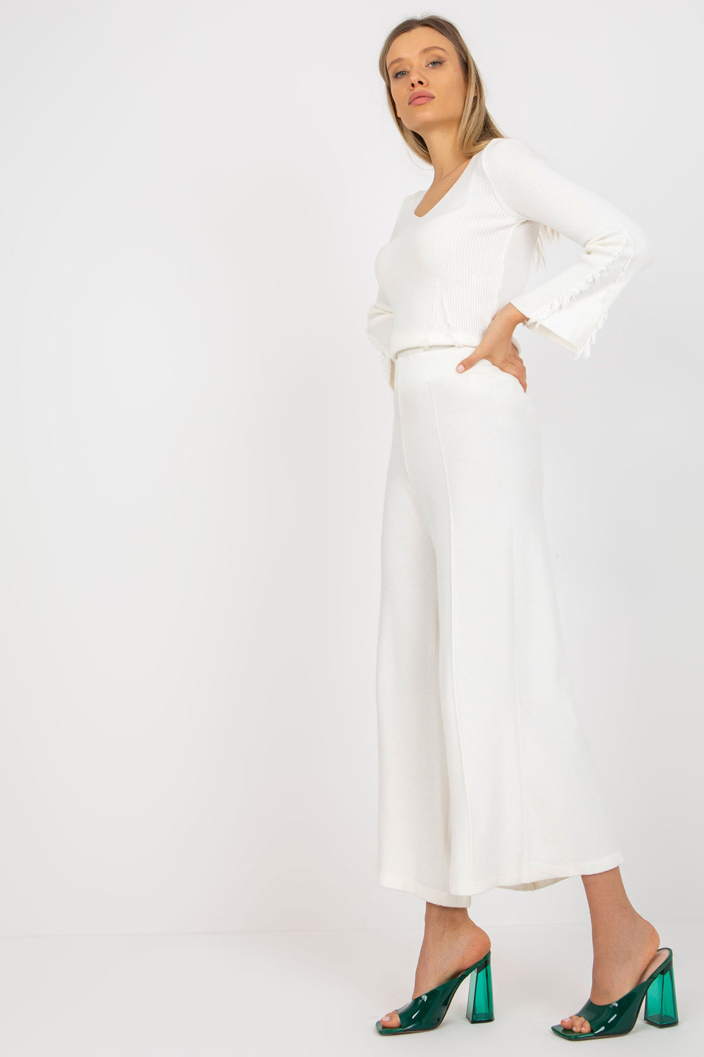 Ecru spalvos megztos moteriškos kelnės plačiomis kojomis .