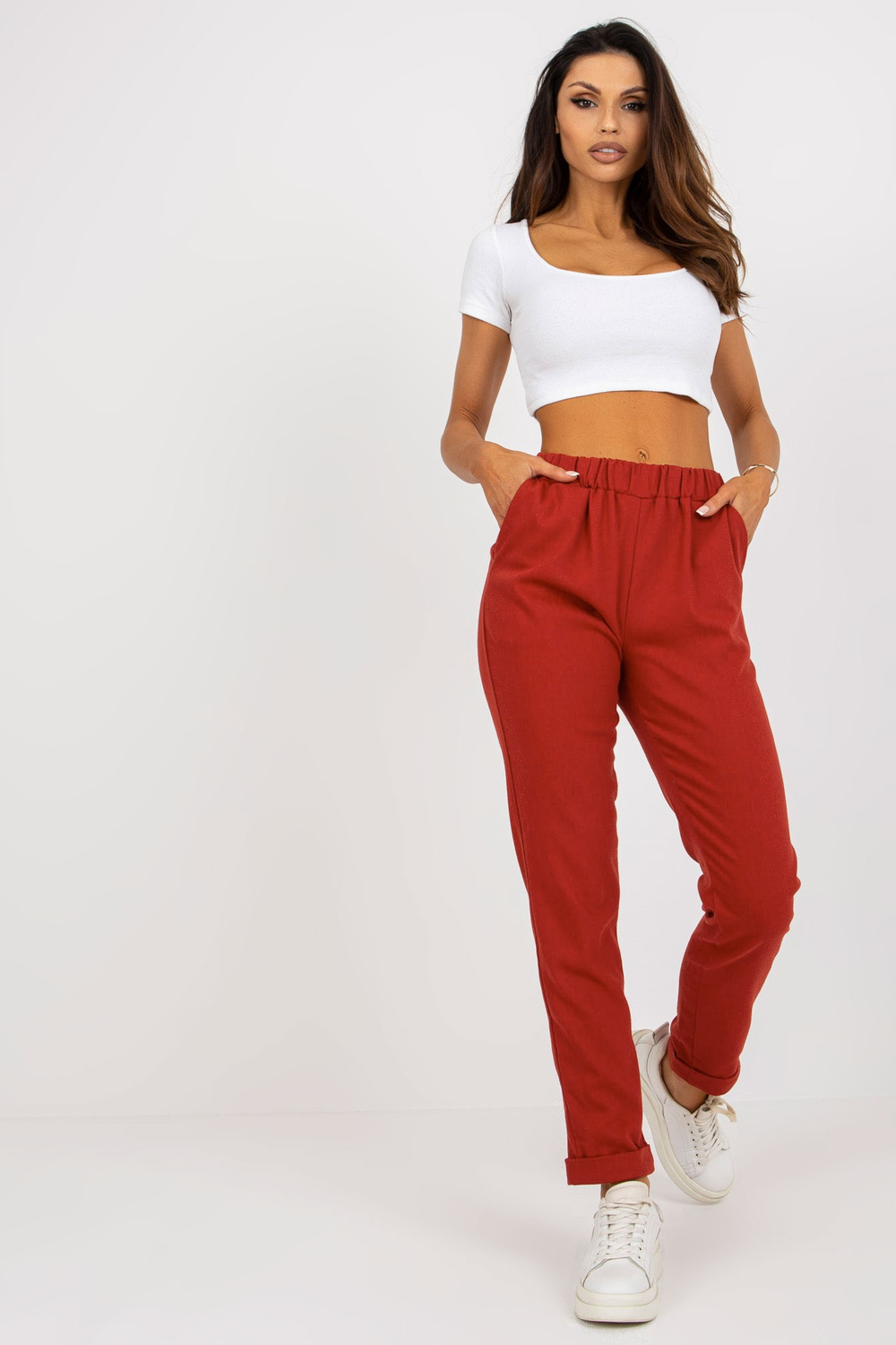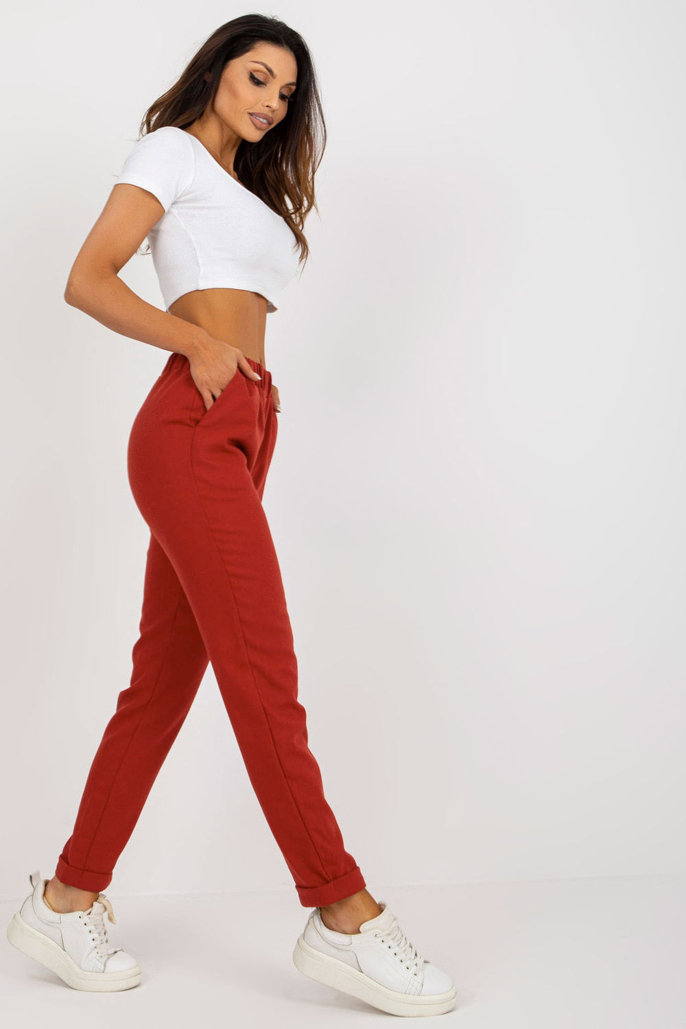 Tamsiai oranžinės kelnės iš audinio su kišenėmis.