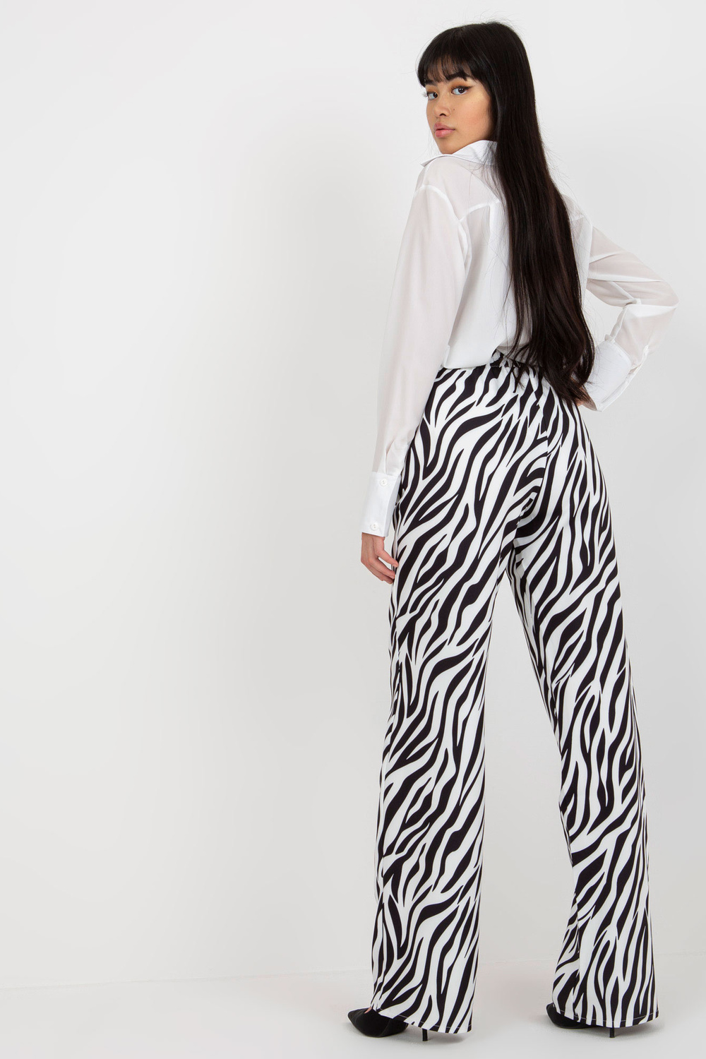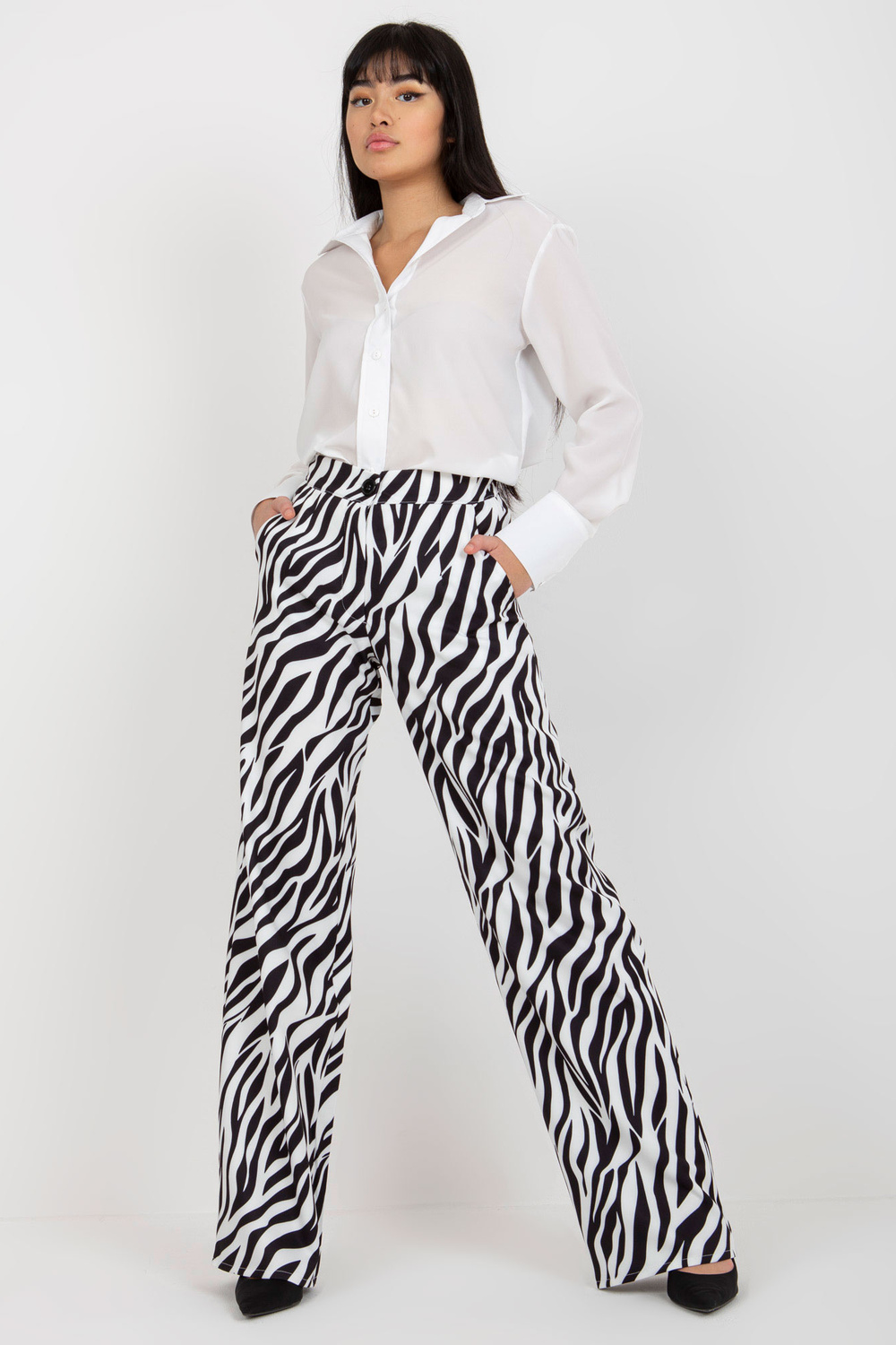 Juodos ir baltos plačios kelnės iš gyvūnų rašto audinio.