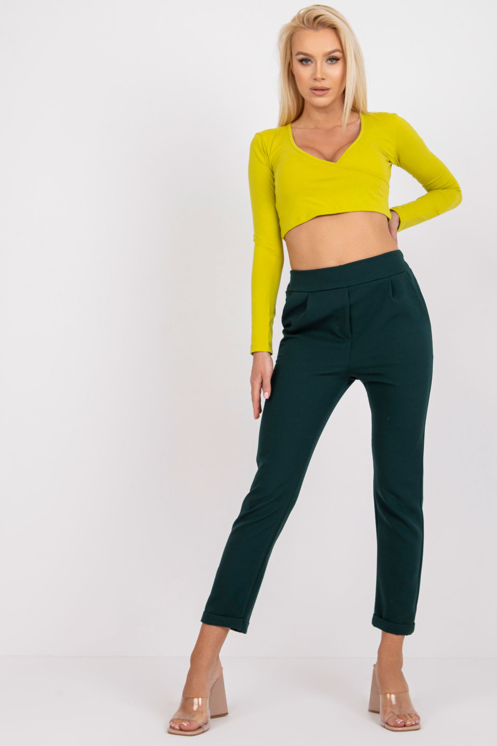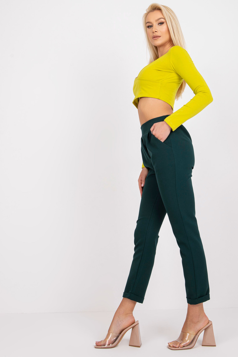 Tamsiai žalios elegantiškos kelnės su Hidalgo kišenėmis .