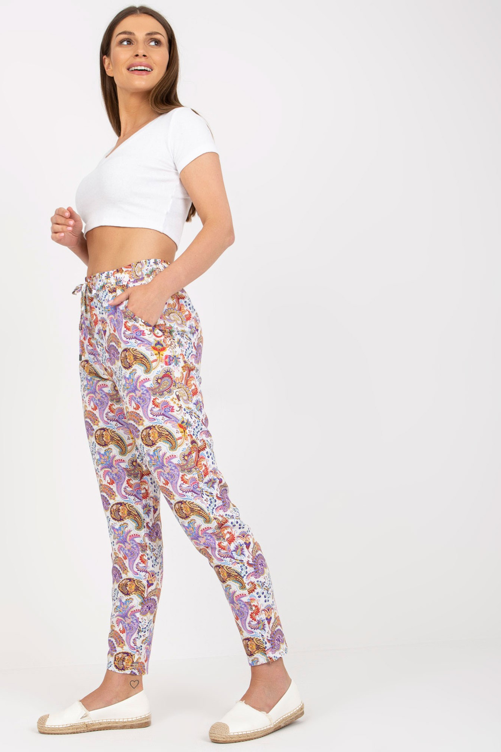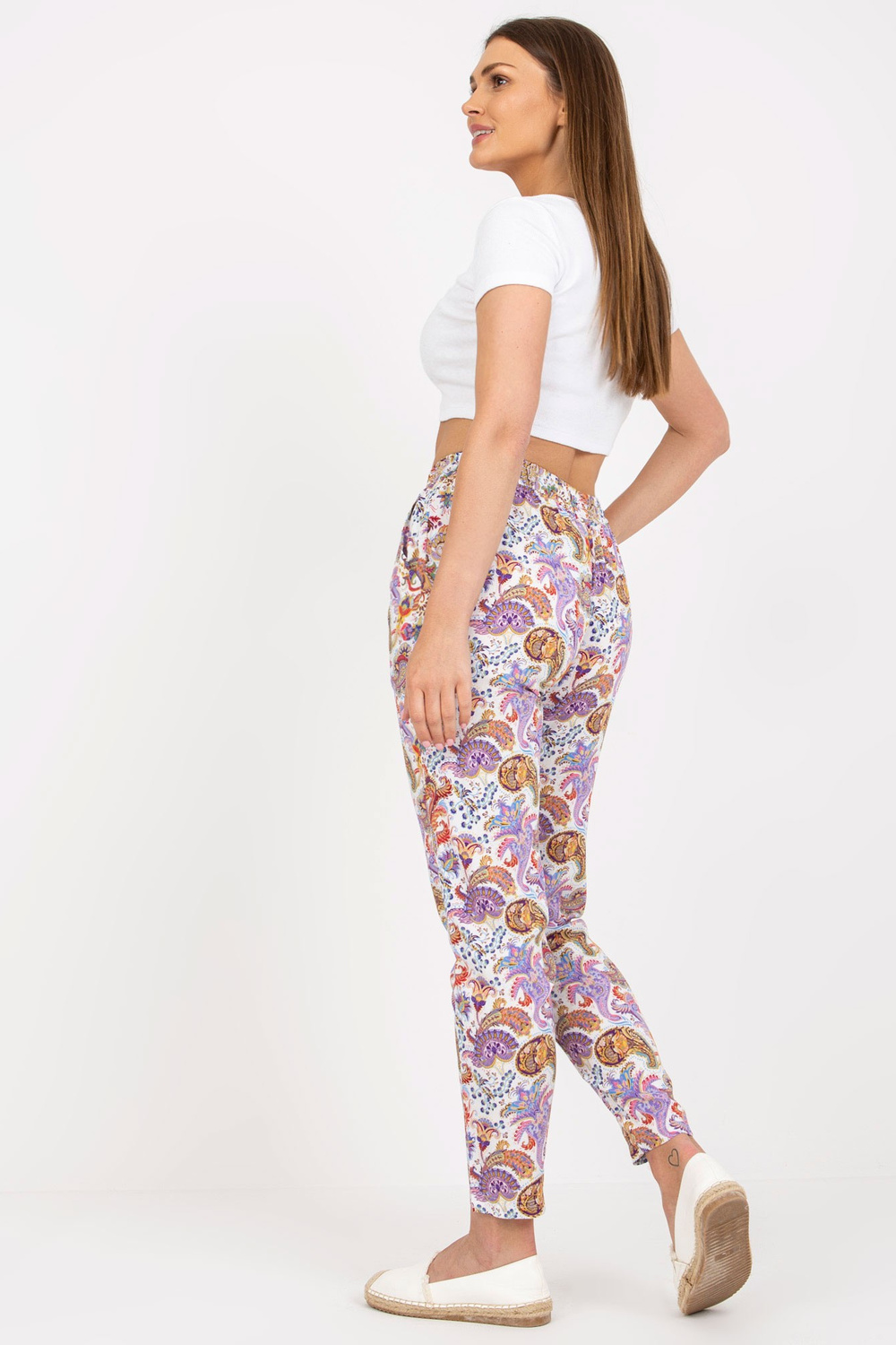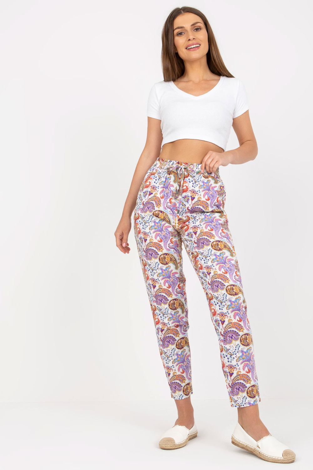 Baltos ir violetinės vasarinės kelnės, pagamintos iš medžiagos su SUBLEVEL raštais .
