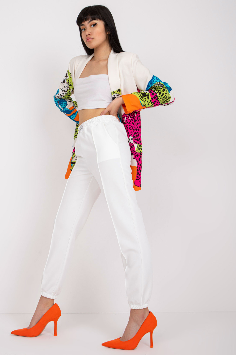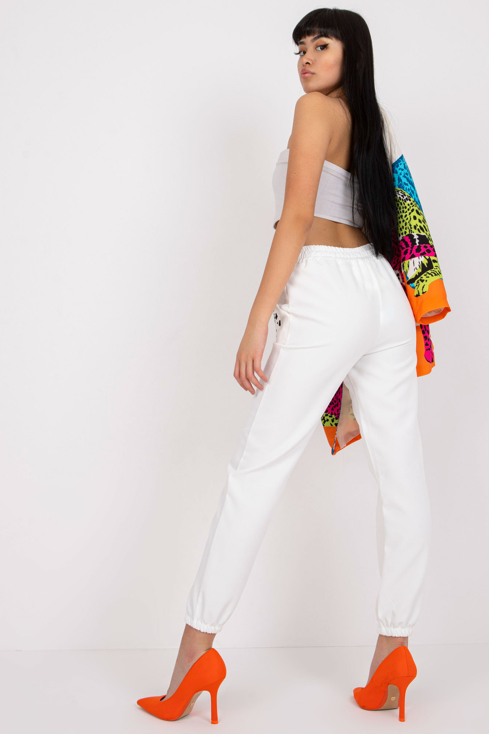 Baltos kelnės iš audinio be užsegimo . medžiagos sudėtis: 95% poliesteris, 5% elastanas skalbimo būdas: skalbimas mašinoje 30°C Gaminio kodas: DHJ-SP-15832.64 dominuojantis raštas: lygus Stilius: Elegantiška galimybė: dirbti kiekvieną dieną, pasimatymui, į oficialų vakarą