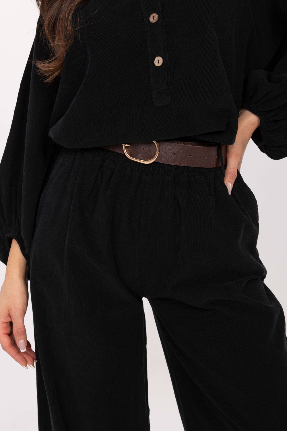 Vieno dydžio kelnių išmatavimai: juosmens plotis - 31 cm (lygiai), juosmens plotis - 53 cm (ištemptas), klubų plotis - 58 cm, kelnių ilgis - 108 cm.