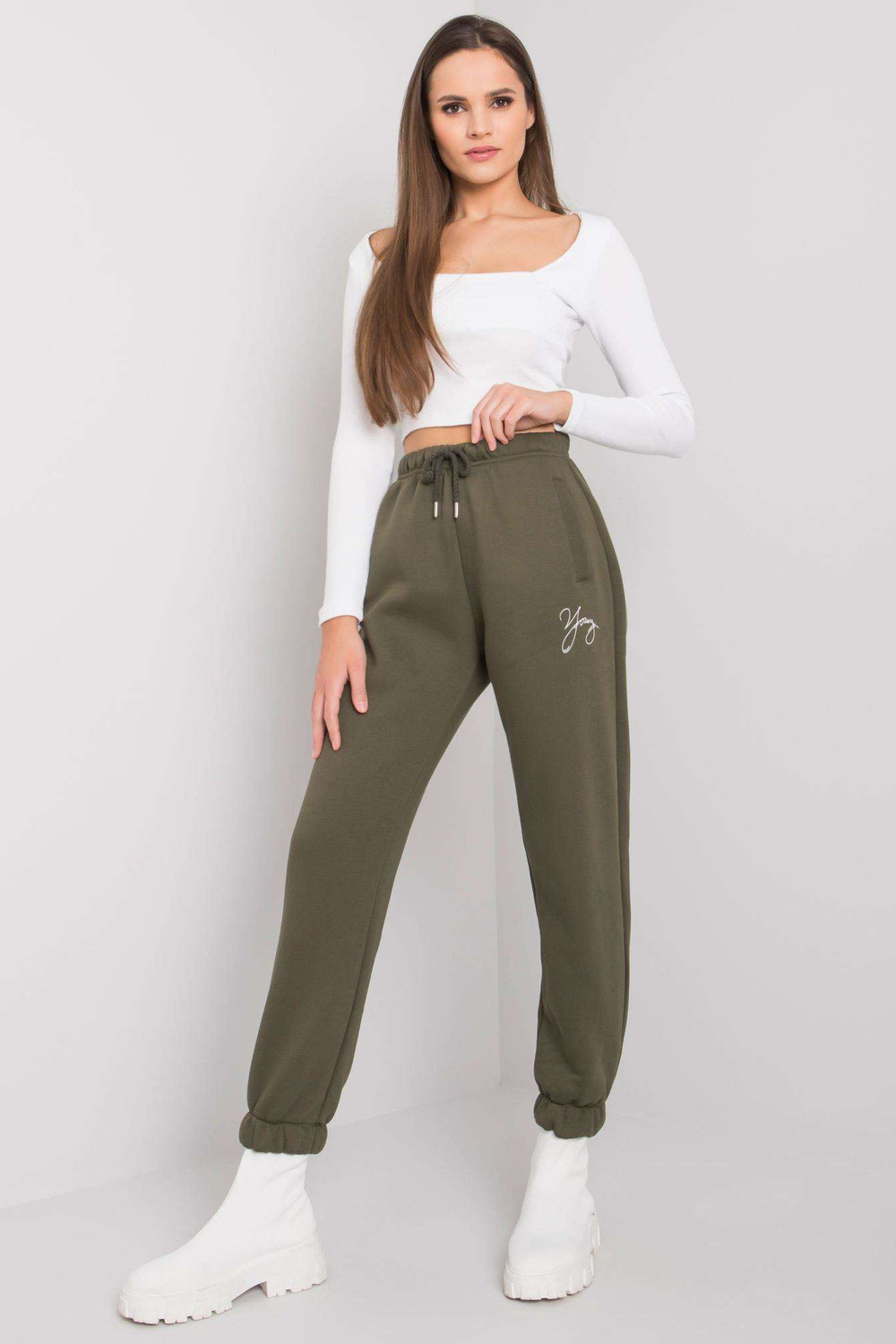 Šviesios chaki spalvos sportinės kelnės su lelijos užrašu.