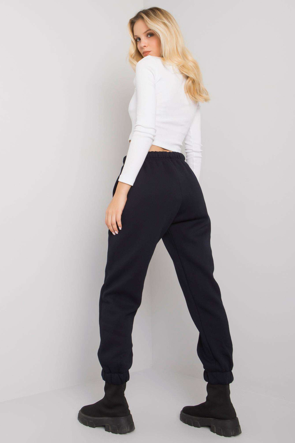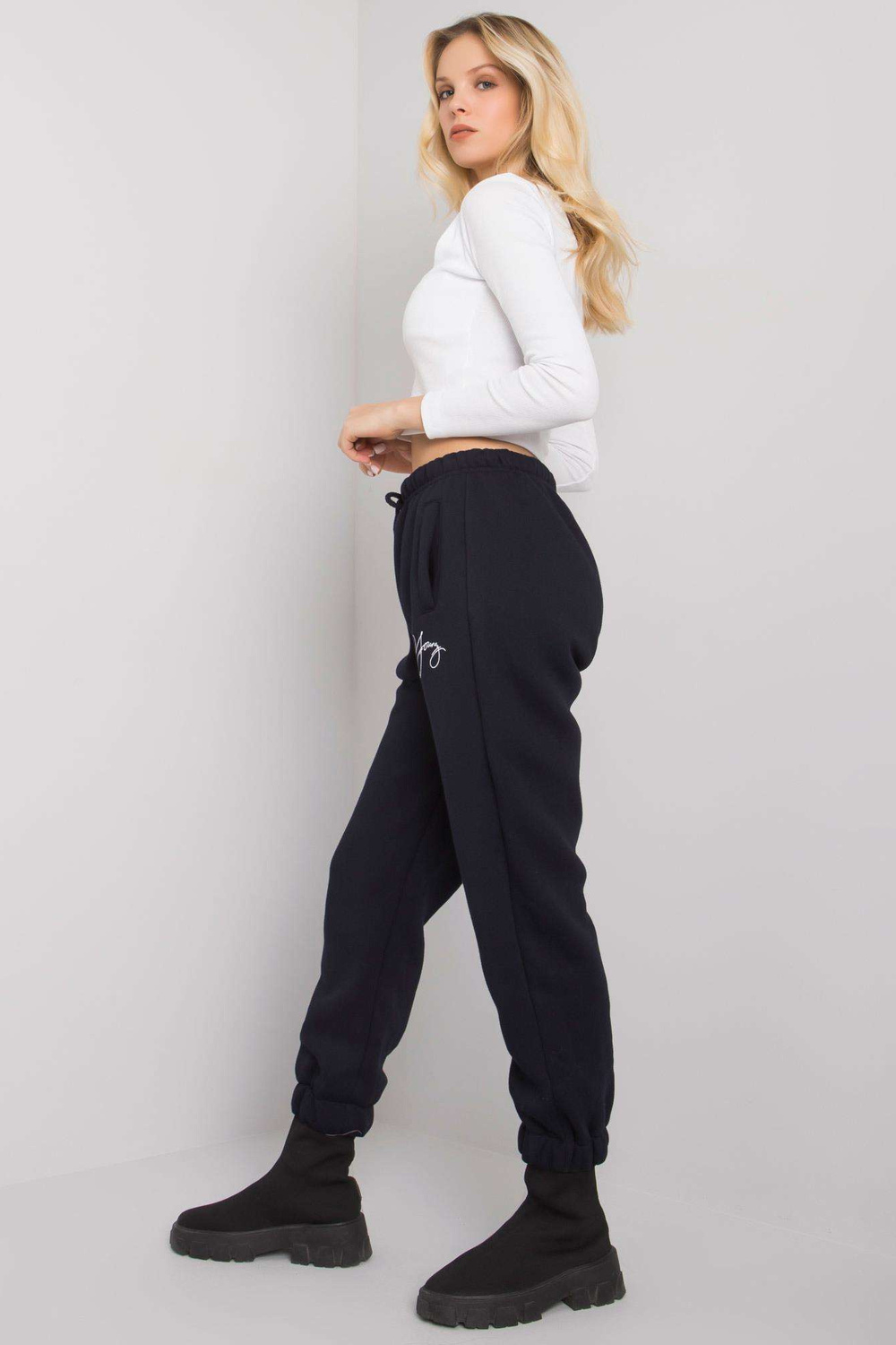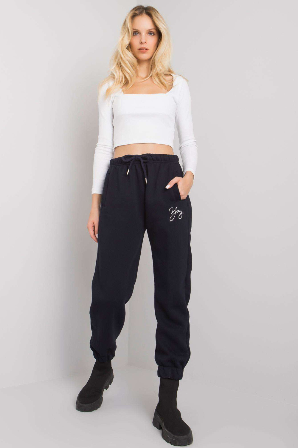 Mėlynos spalvos sportinės kelnės su lelijos užrašu.