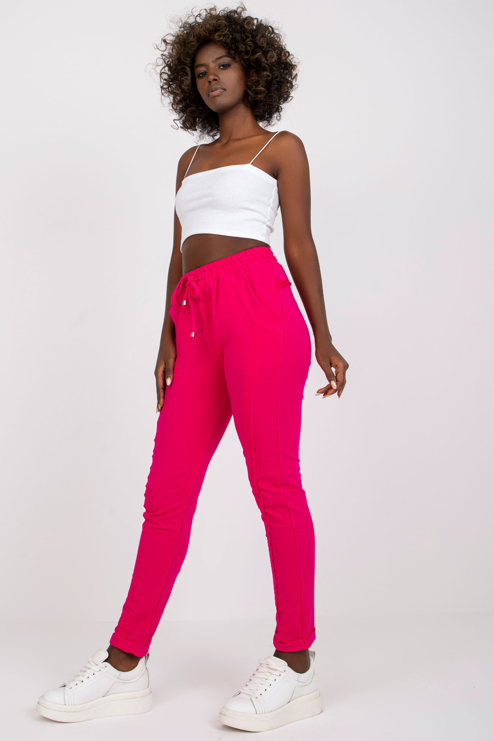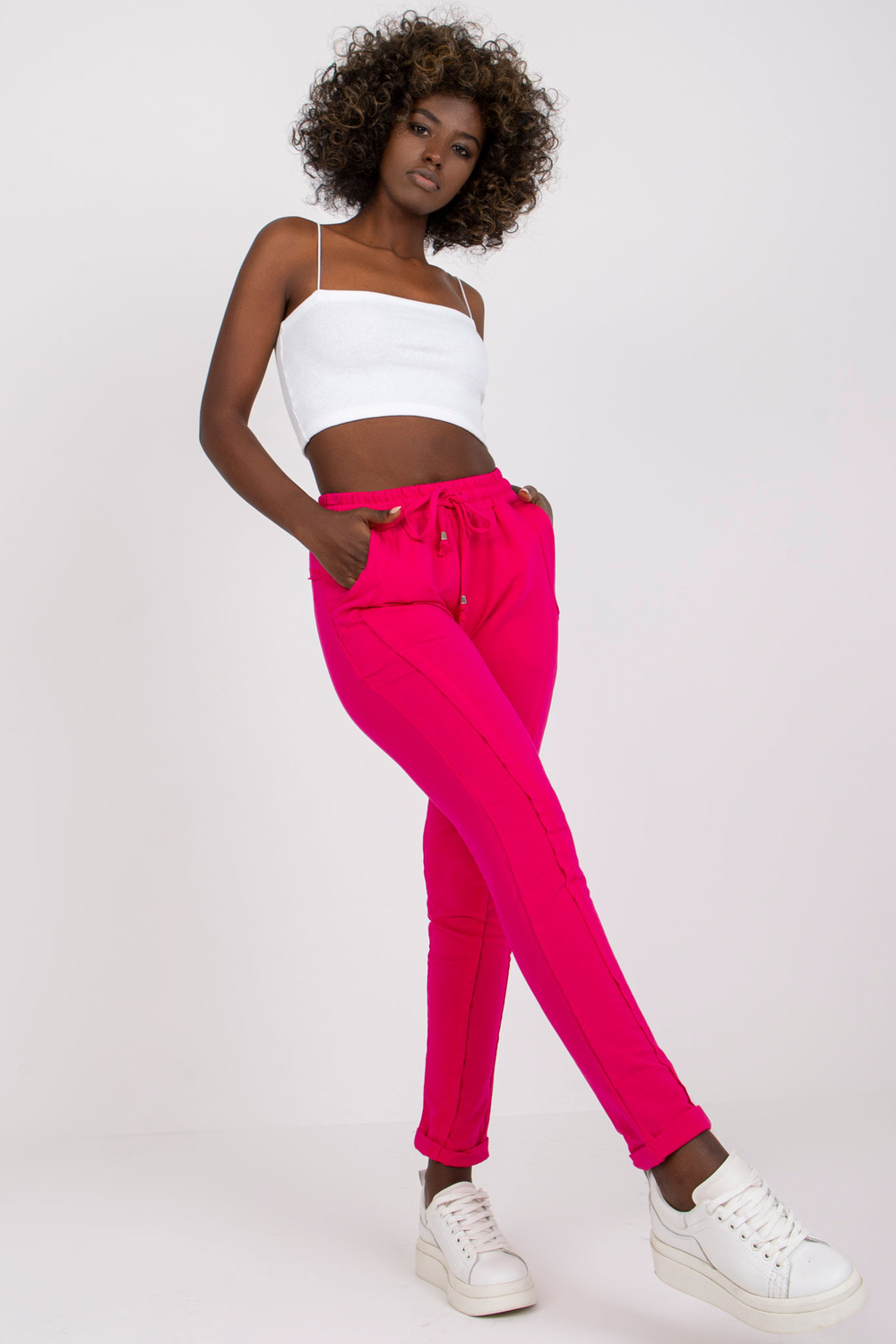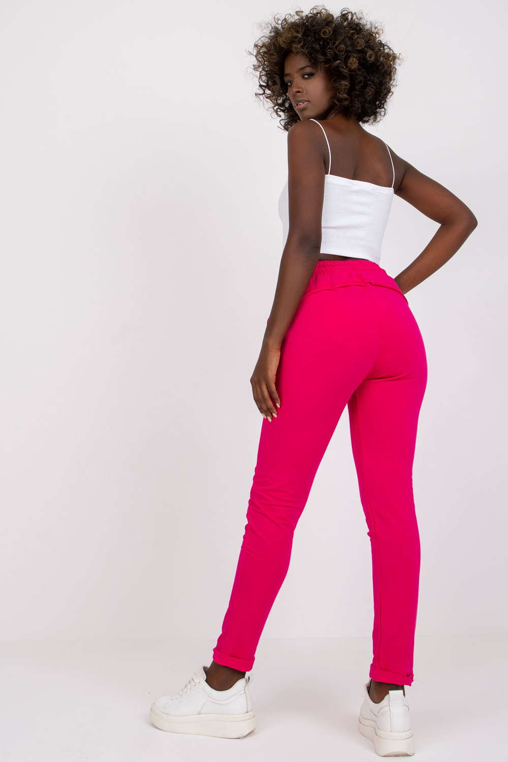 Prieinamos fuksijos spalvos kelnės.