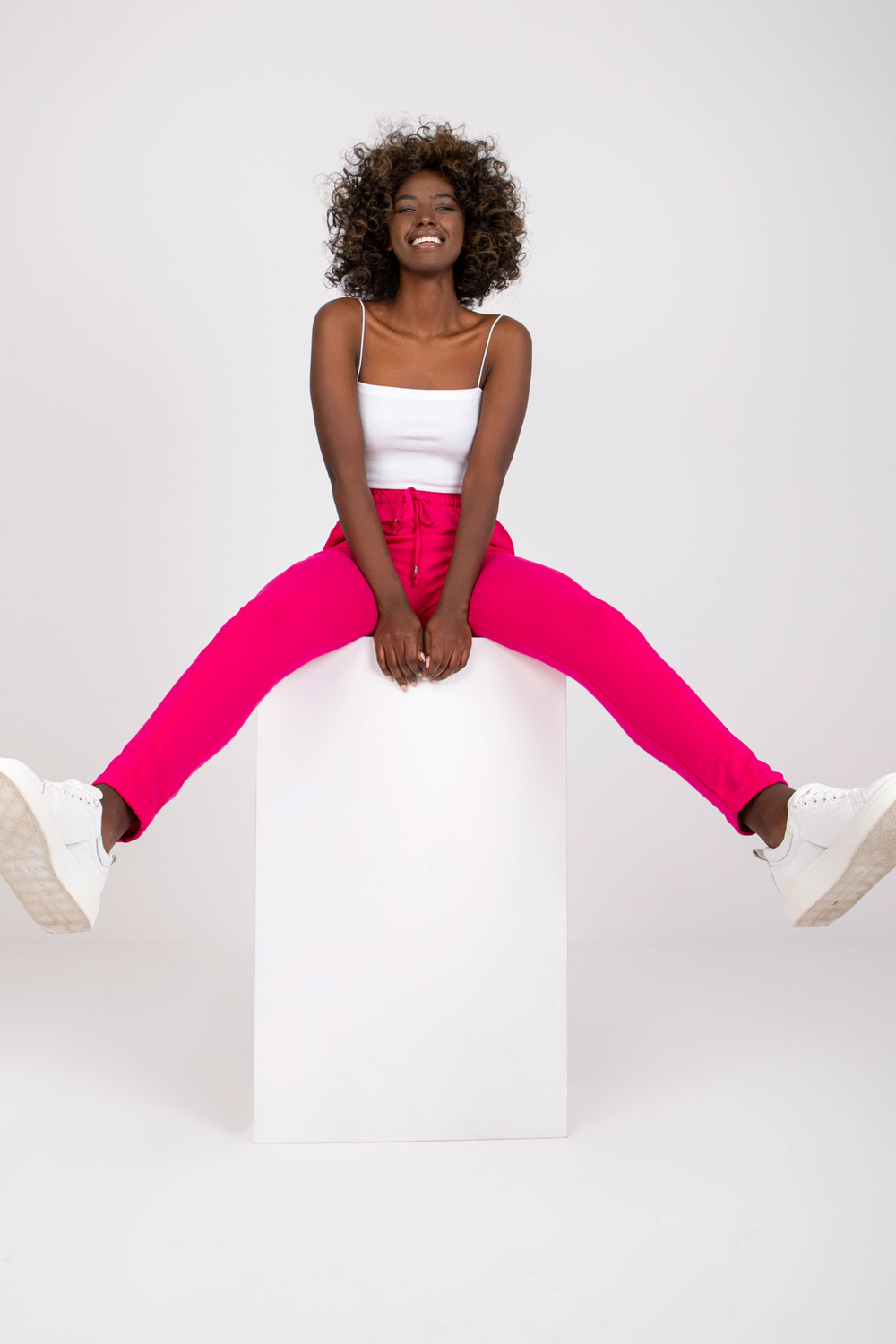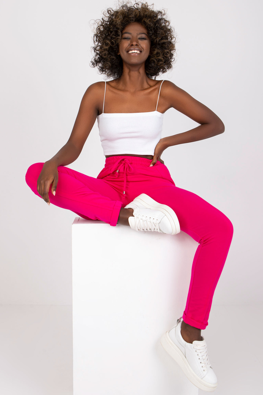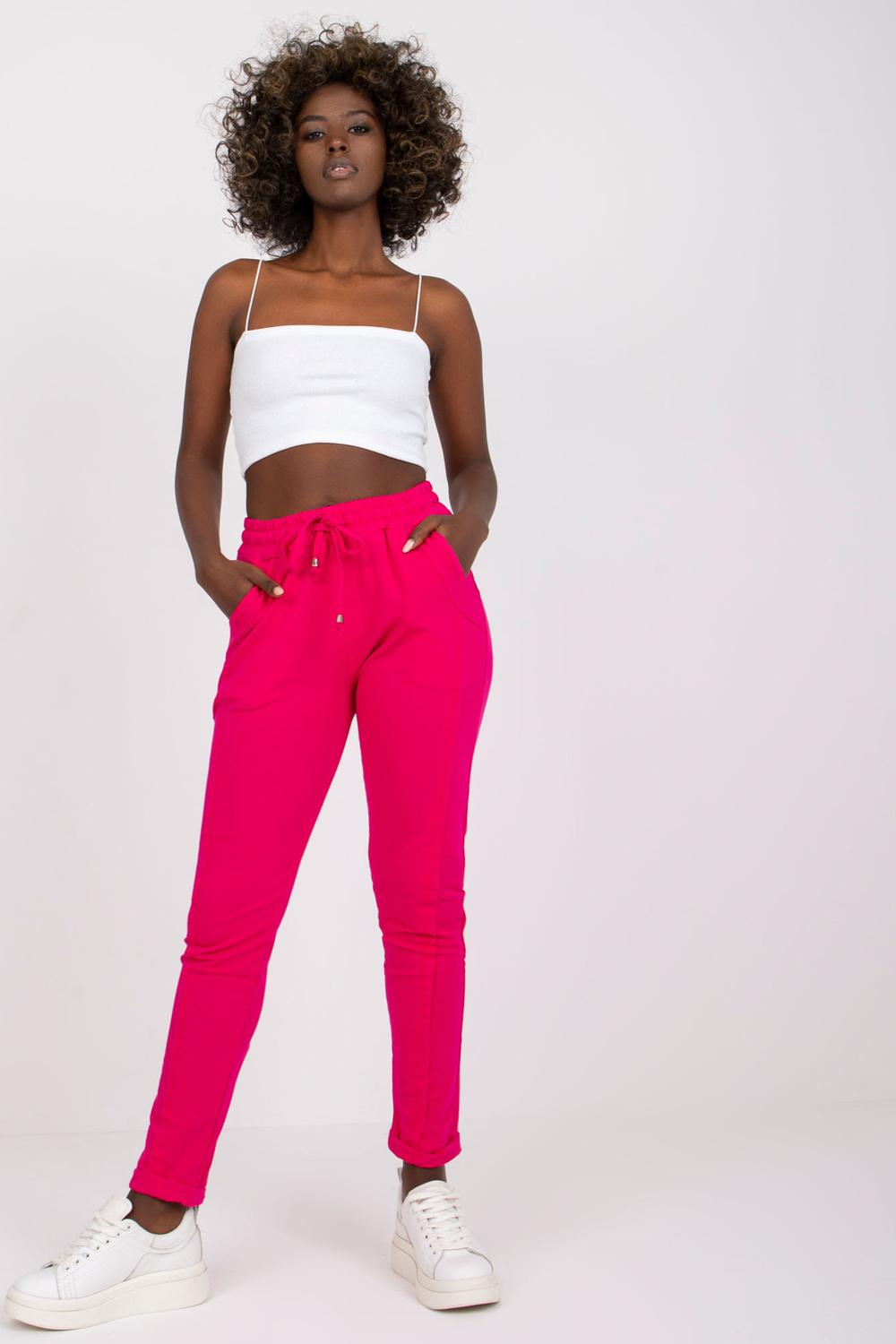 Prieinamos fuksijos spalvos kelnės.