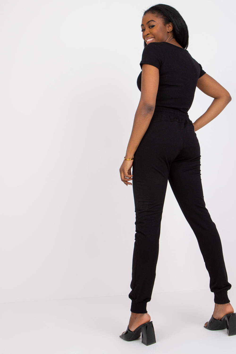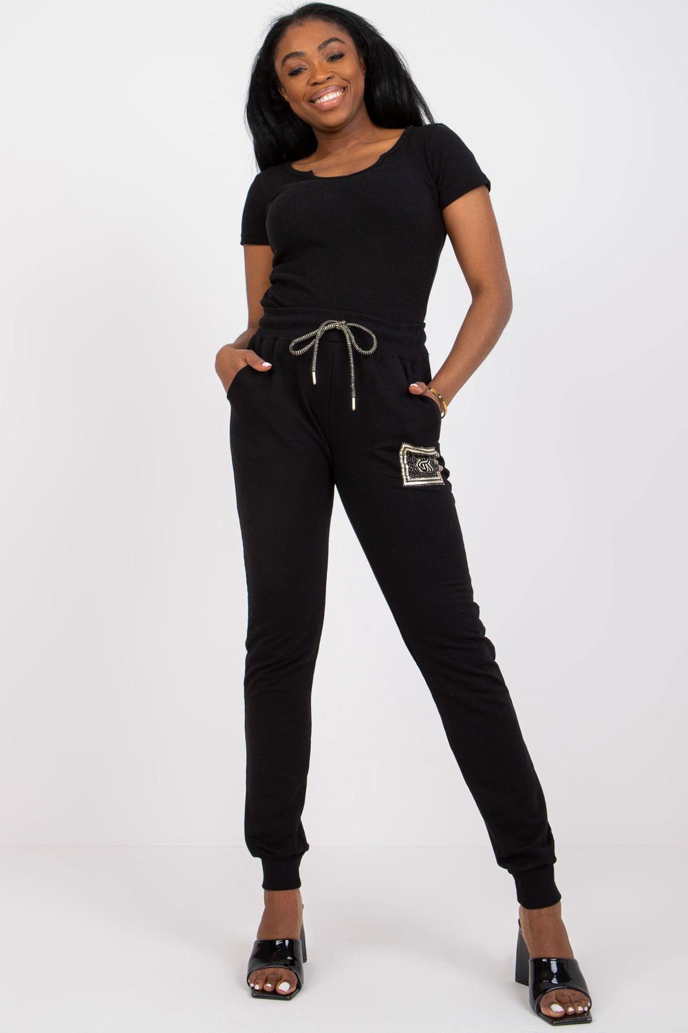 Juodos moteriškos sportinės kelnės su cirkoniais. aksesuarai: kišenės, petnešėlės, elastingumas ties juosmeniu medžiagasudėtis: 90% medvilnė, 10% elastanas skalbimo būdas: skalbimas mašinoje 30°C Gaminio kodas: RV-DR-7284.43 dominuojantis raštas: be rašto Stilius: casua