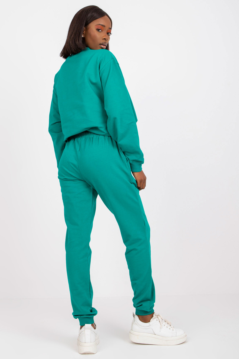 Tamsiai žalios paprastos sportinės kelnės aukštu juosmeniu.