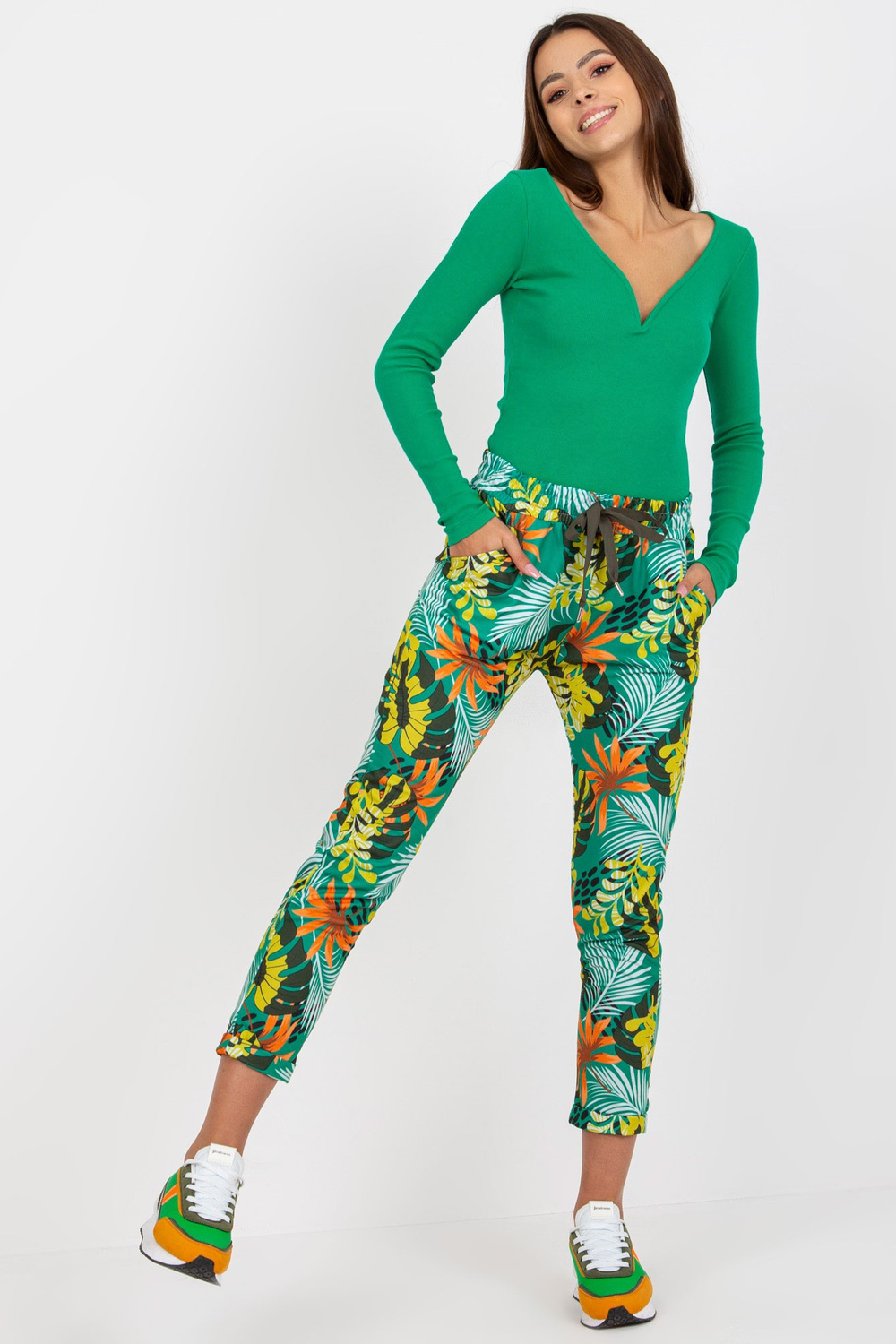 Žaliais raštais puoštos sportinės kelnės su kišenėmis .