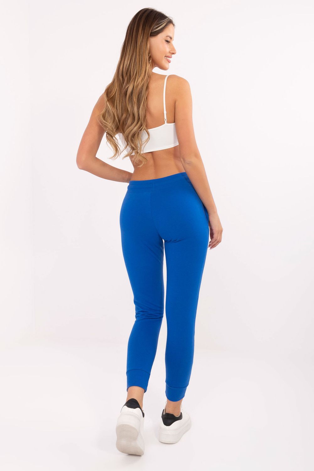 Tamsiai mėlynos pagrindinės sportinės kelnės aukštu juosmeniu .