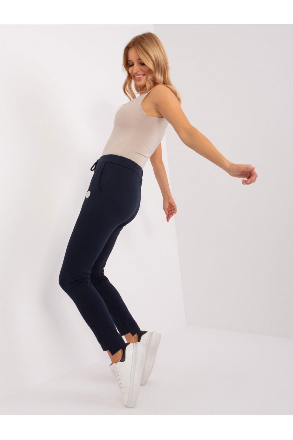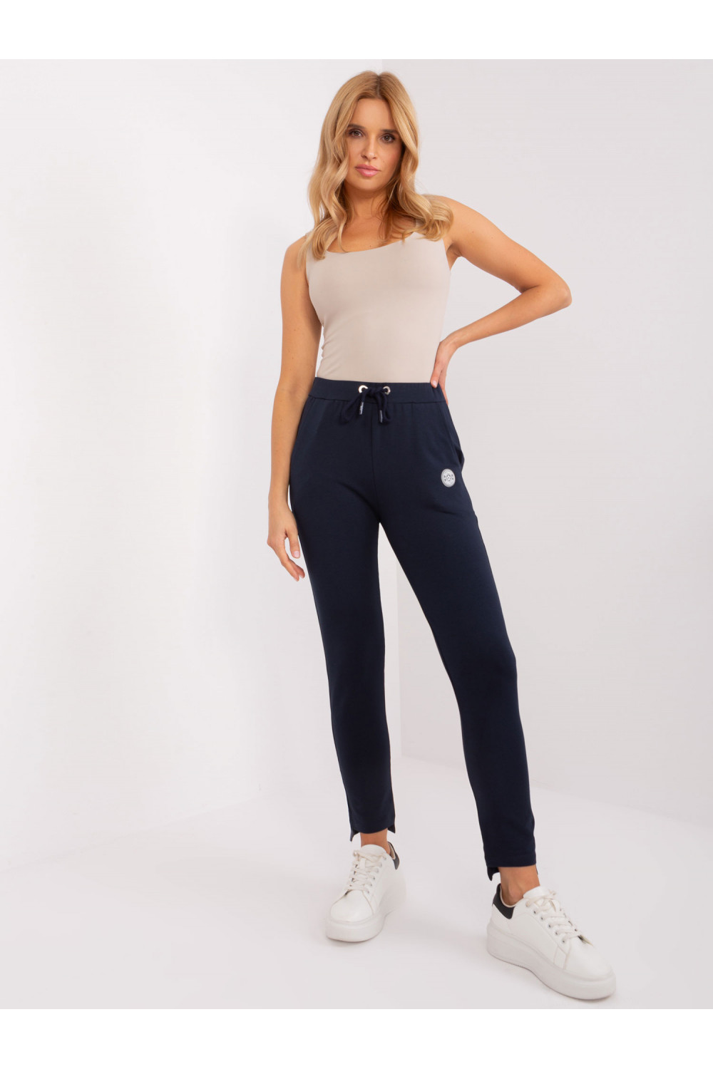 Tamsiai mėlynos sportinės kelnės tiesiomis kojomis .