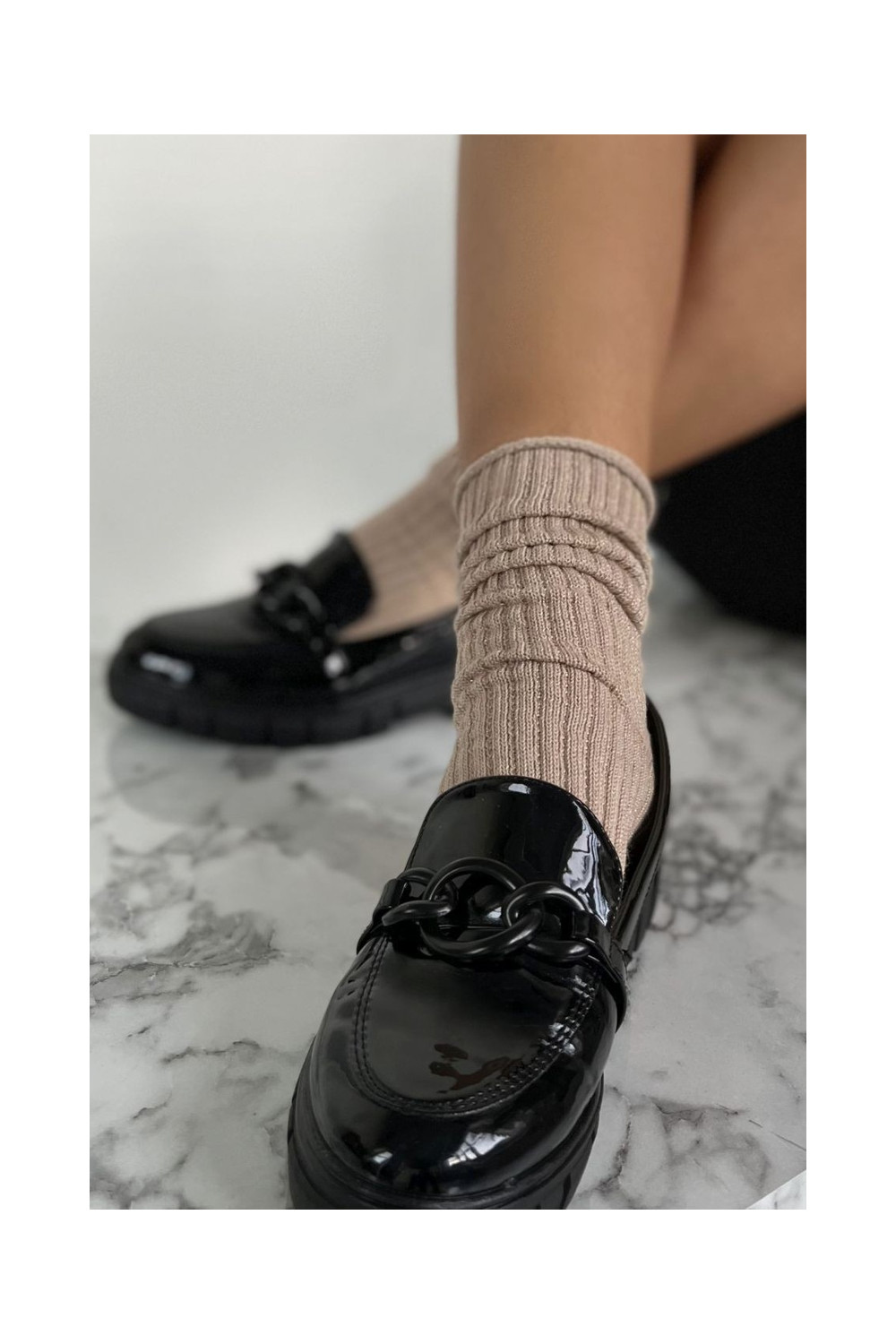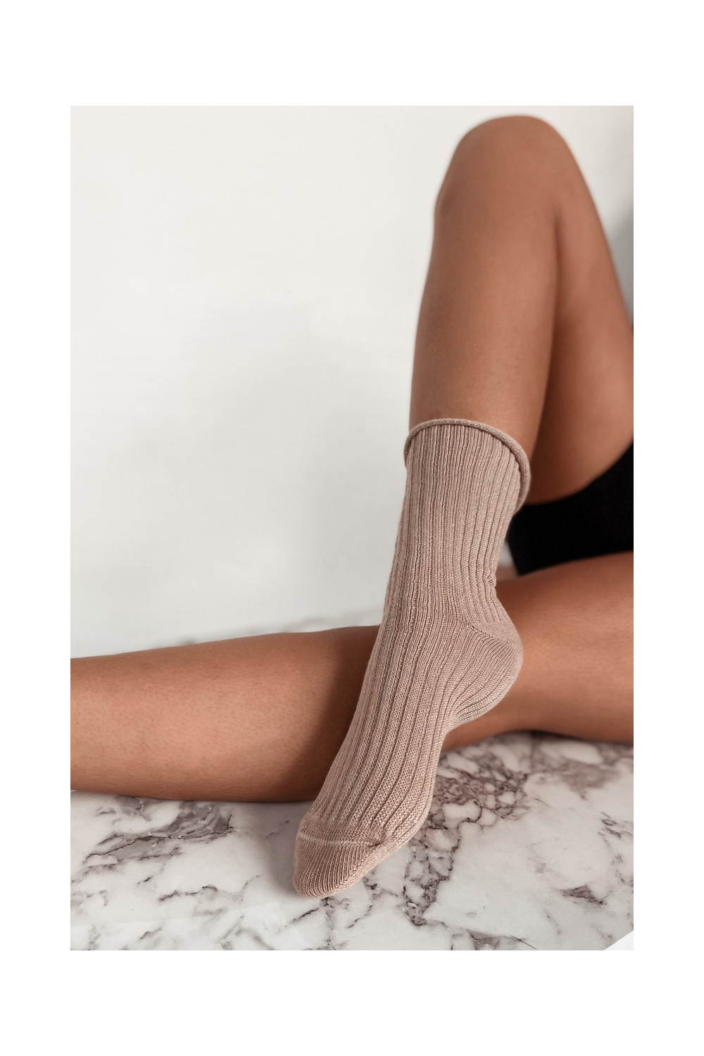 Smėlio spalvos moteriškos kojinės be spaudimo, dryžuotos su Lurex siūlu