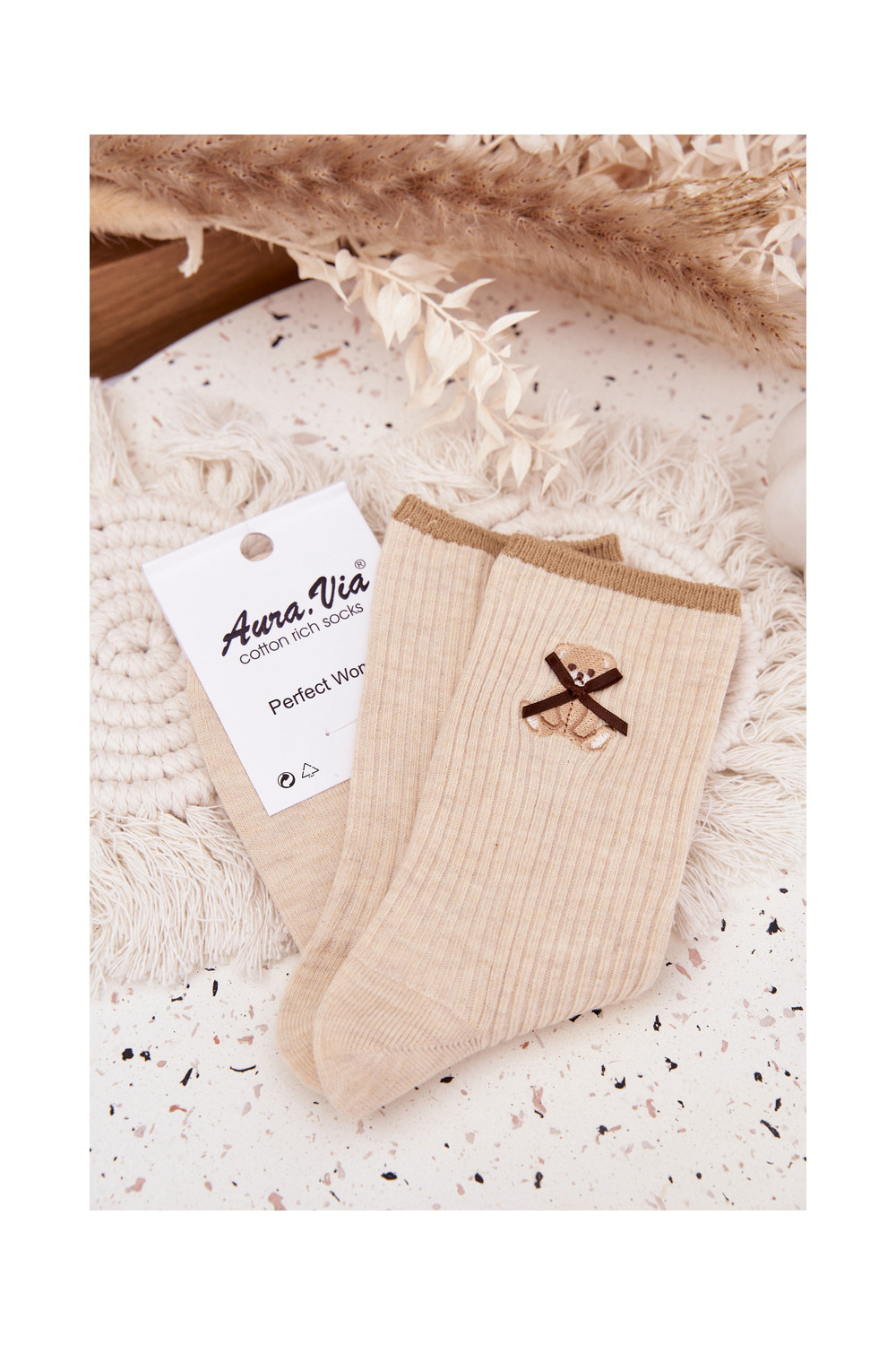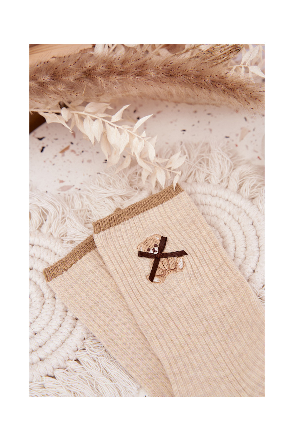 Medvilninės kojinės su dryžiais Su Meškiuku smėlio spalvos