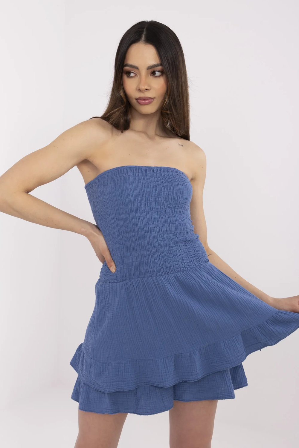 Modelis dėvi vieno dydžio dydį. Modelio išmatavimai: ūgis 175 cm, krūtinė 90 cm, juosmuo 66 cm, klubai 94 cm.