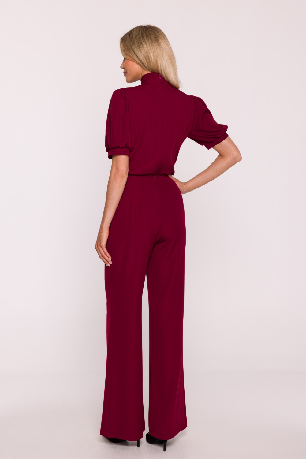 An elegant women's jumpsuit is a stylish alternative to a suknelė, perfect for special occasions and elegant outings. Made of smooth Medžiaga: with a light sheen, it looks extremely chic while guaranteeing comfort. The features a feminine V-neckline, combined with a stand-up collar transitioning into an eye-catching tie, adding delicate finesse to the whole. The short, puffy sleeves are finished with a cuff with subtle gathering, giving the silhouette a light and romantic character. The top has a slightly palaidinėd fit, while the high-waisted waist beautifully accentuates the figure and visually lengthens the legs. The long, wide, slightly flared trousers provide the silhouette with elegant proportions and ensure freedom of movement. The whole is complemented by a concealed zipper at the back, guaranteeing a perfect fit. Designed and sewn in Poland with attention to detail and the highest quality finishing.