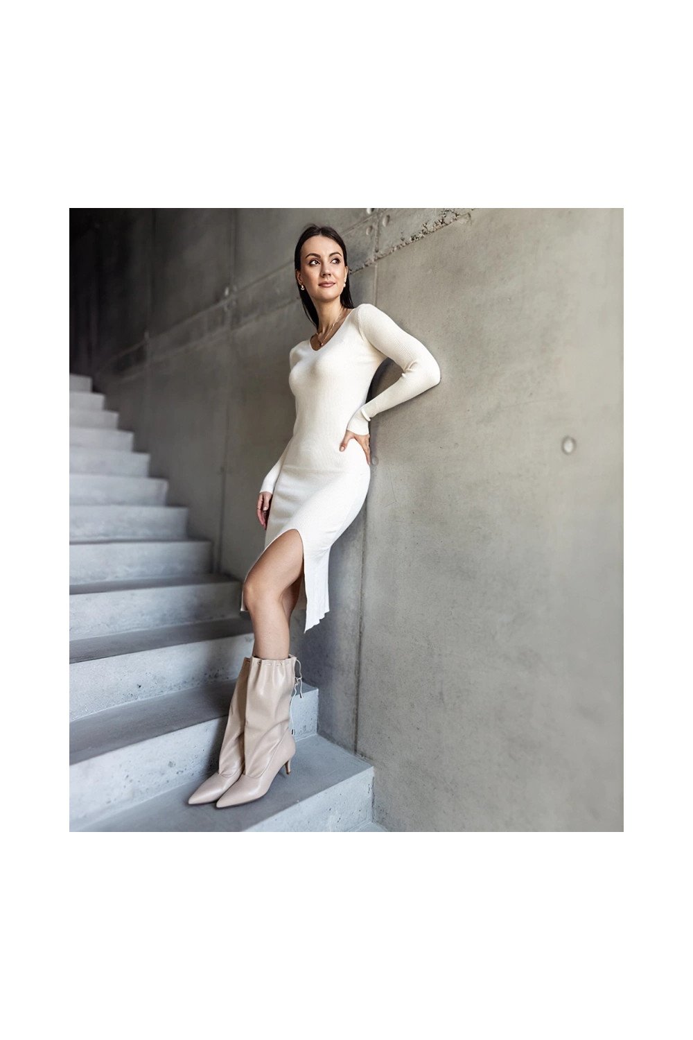 Ilga šviesiai smėlio spalvos suknelė su skeltuku Leona