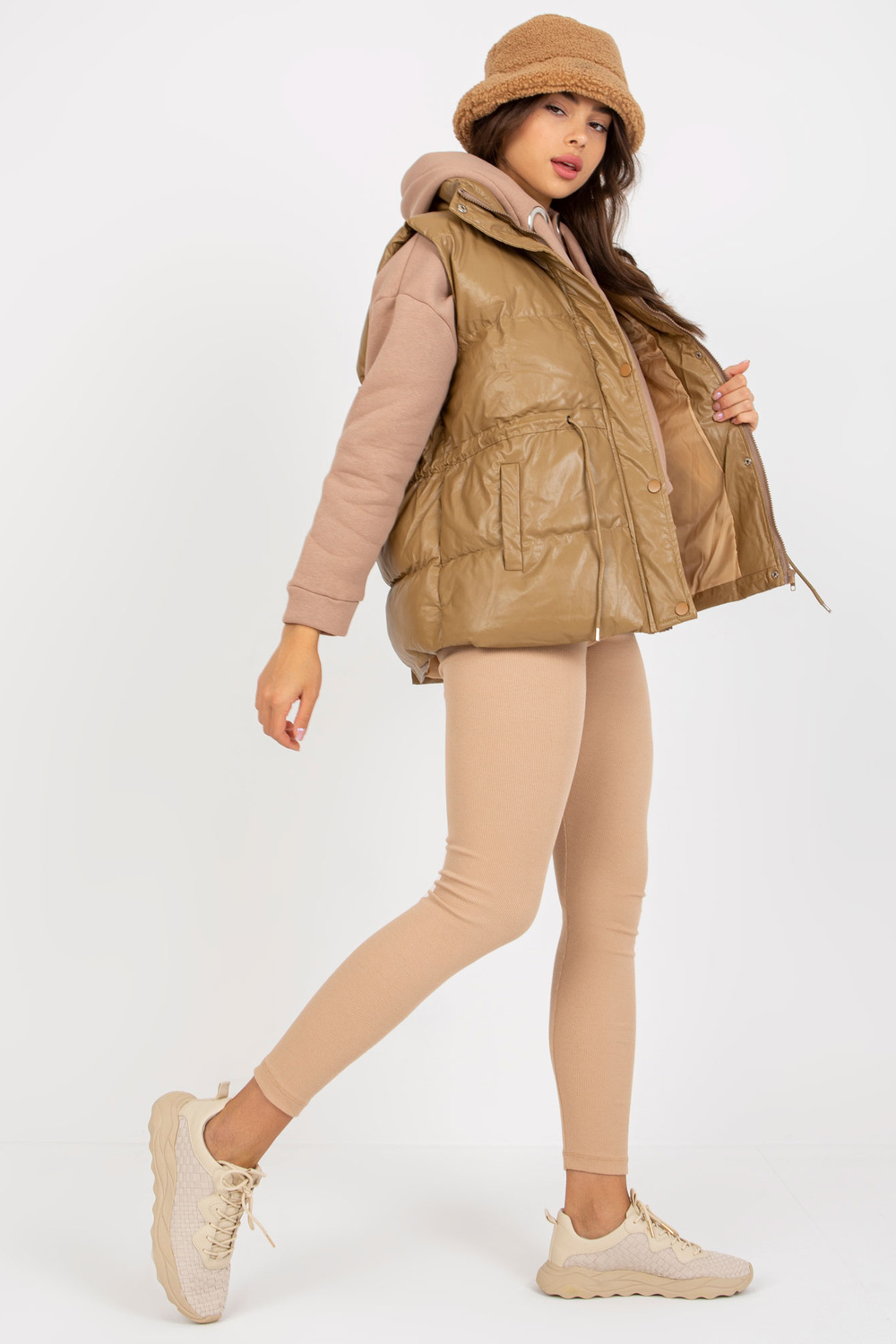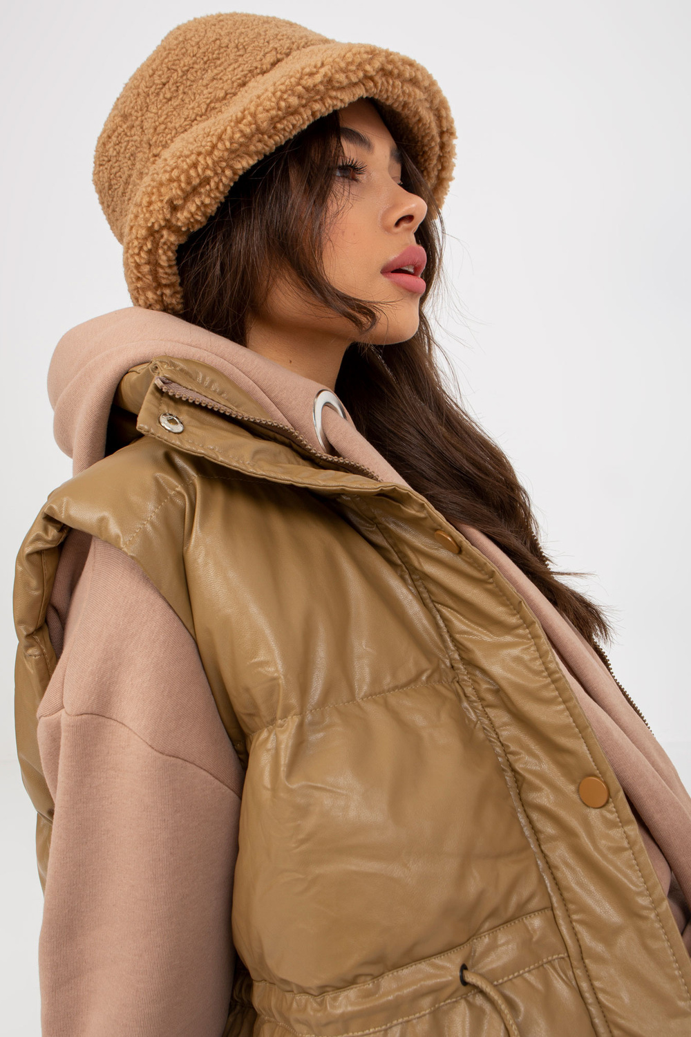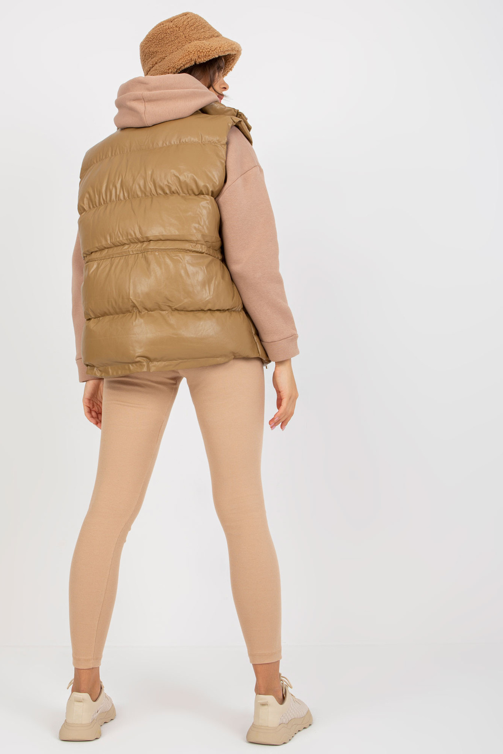 Kupranugarių pūkų liemenė iš eko odos su skiautine.