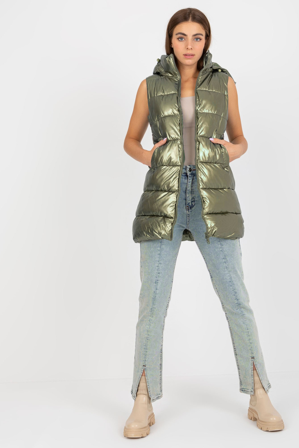 Tamsiai žalia žieminė pūkinė liemenė su gobtuvu.