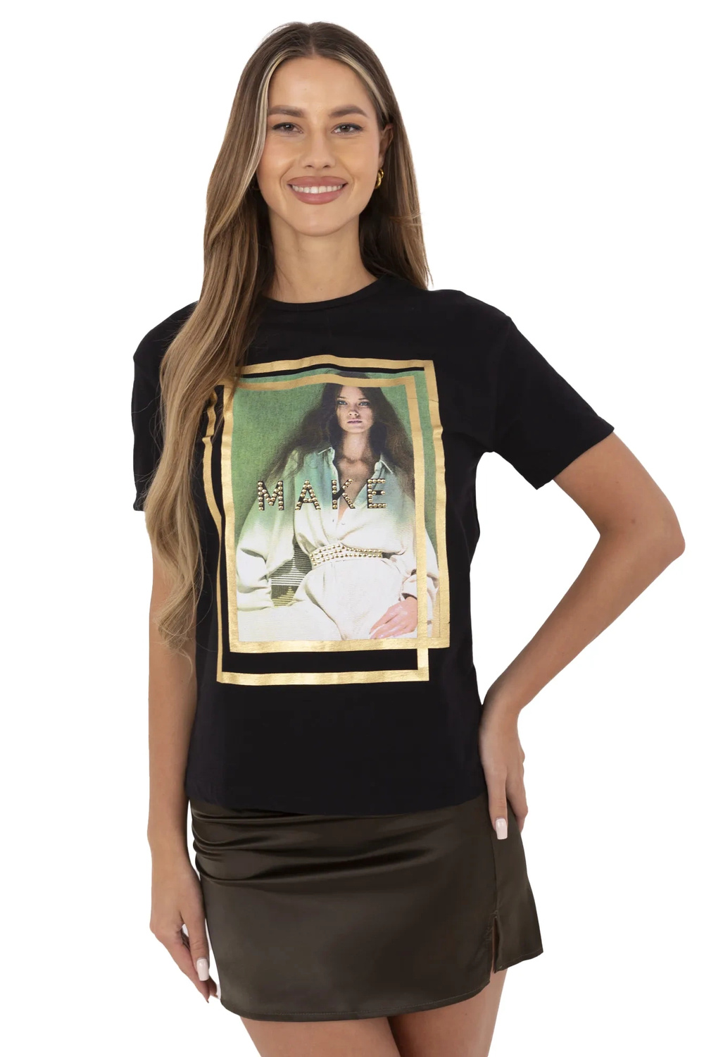 Estherblack marškinėliai. medžiagos sudėtis: 100% medvilnė skalbimo būdas: skalbimas mašinoje 30°C Modelis dėvi S dydį. Modelio matmenys: aukštis 175 cm, krūtinė 85 cm, juosmuo 63 cm, klubai 95 cm. S dydžio viršaus matmenys, matuojami plokščiai: pažastys su