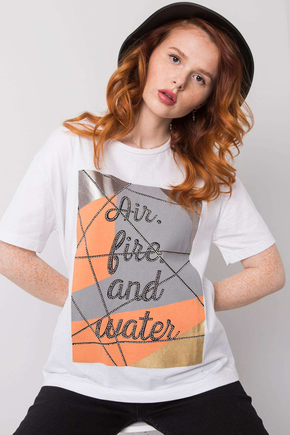 Modelis dėvi S dydį. Modelio matmenys: ūgis 165 cm, krūtinė 83 cm, juosmuo 64 cm, klubai 90 cm.
