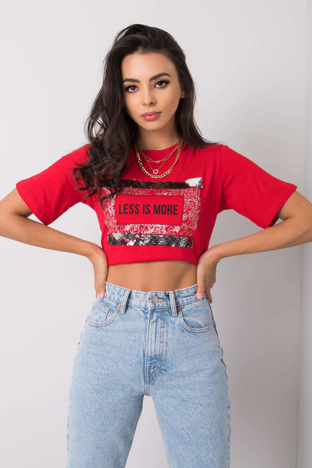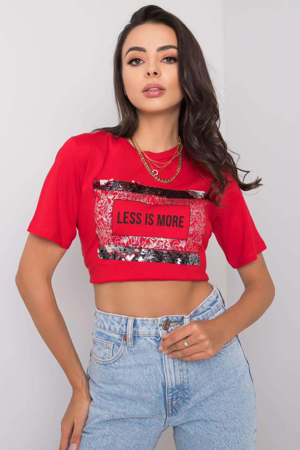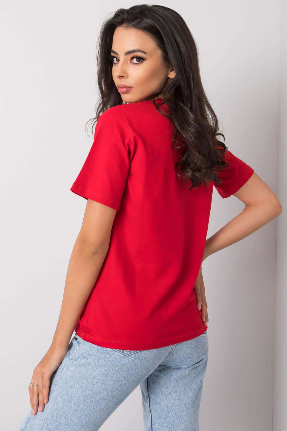 Raudoni marškinėliai su Nikki užrašu .