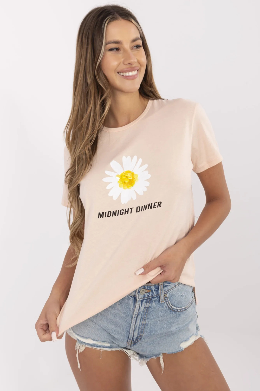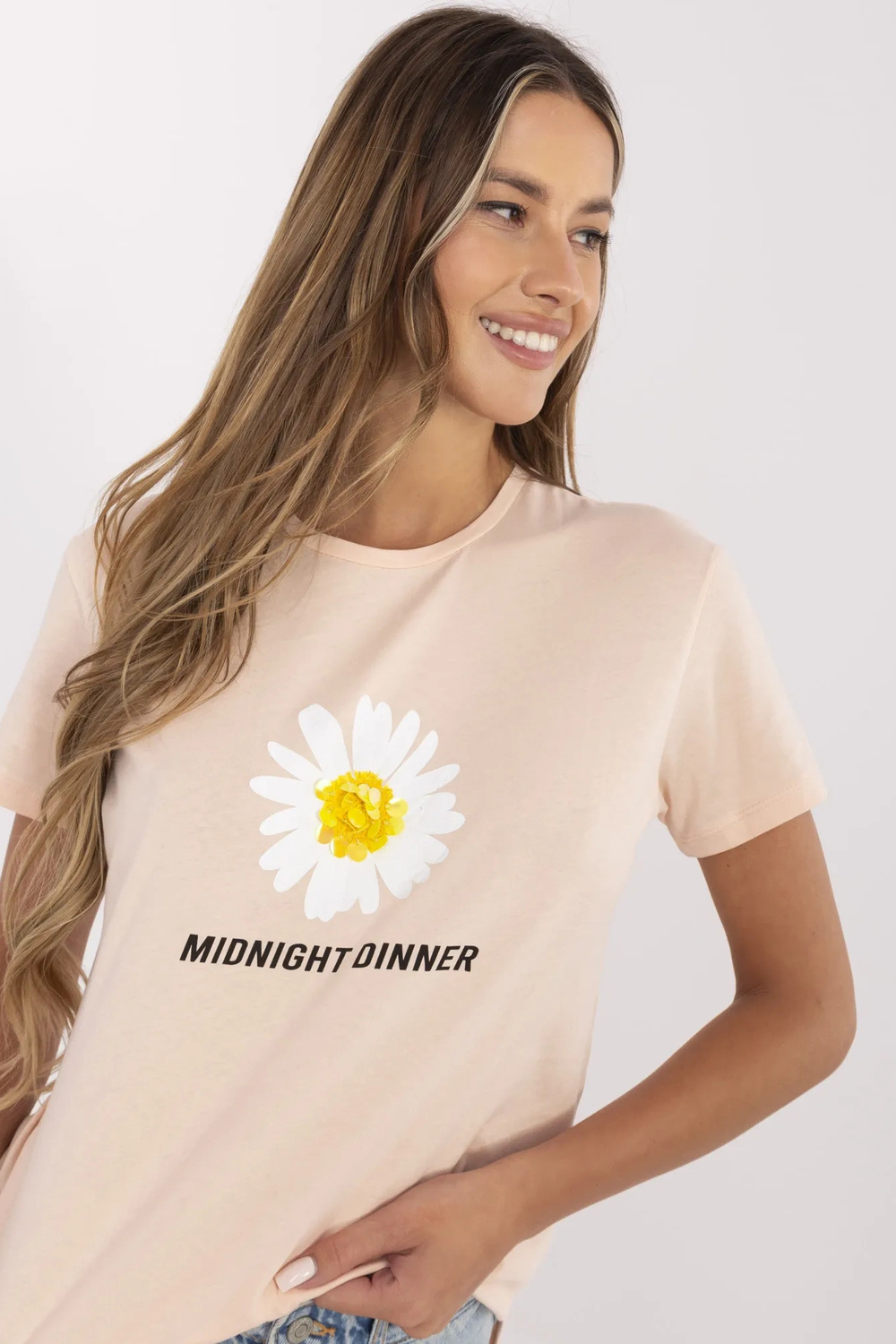 Lašišos marškinėliai su Betsy aplikacijomis. medžiagos sudėtis: 100% medvilnė, skalbimas rankomis. Modelis dėvi S dydį. Modelio išmatavimai: aukštis 175 cm, krūtinė 84 cm, juosmuo 61 cm, klubai 91 cm. S dydžio marškinėlių matmenys, matuojami plokščiai: plotis po