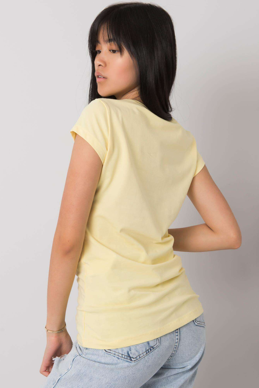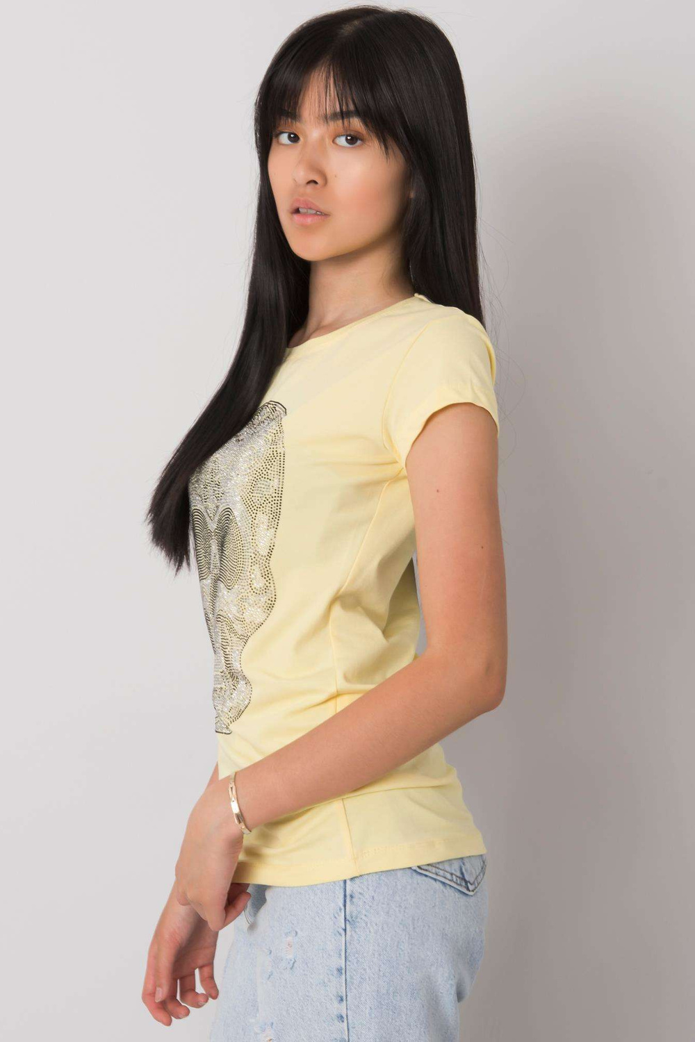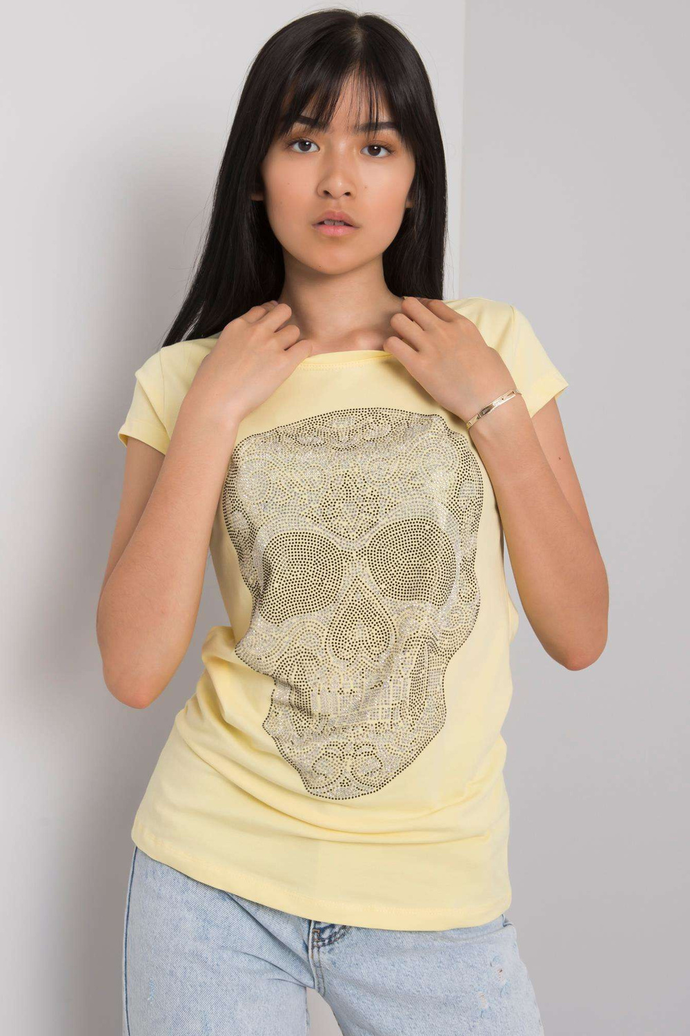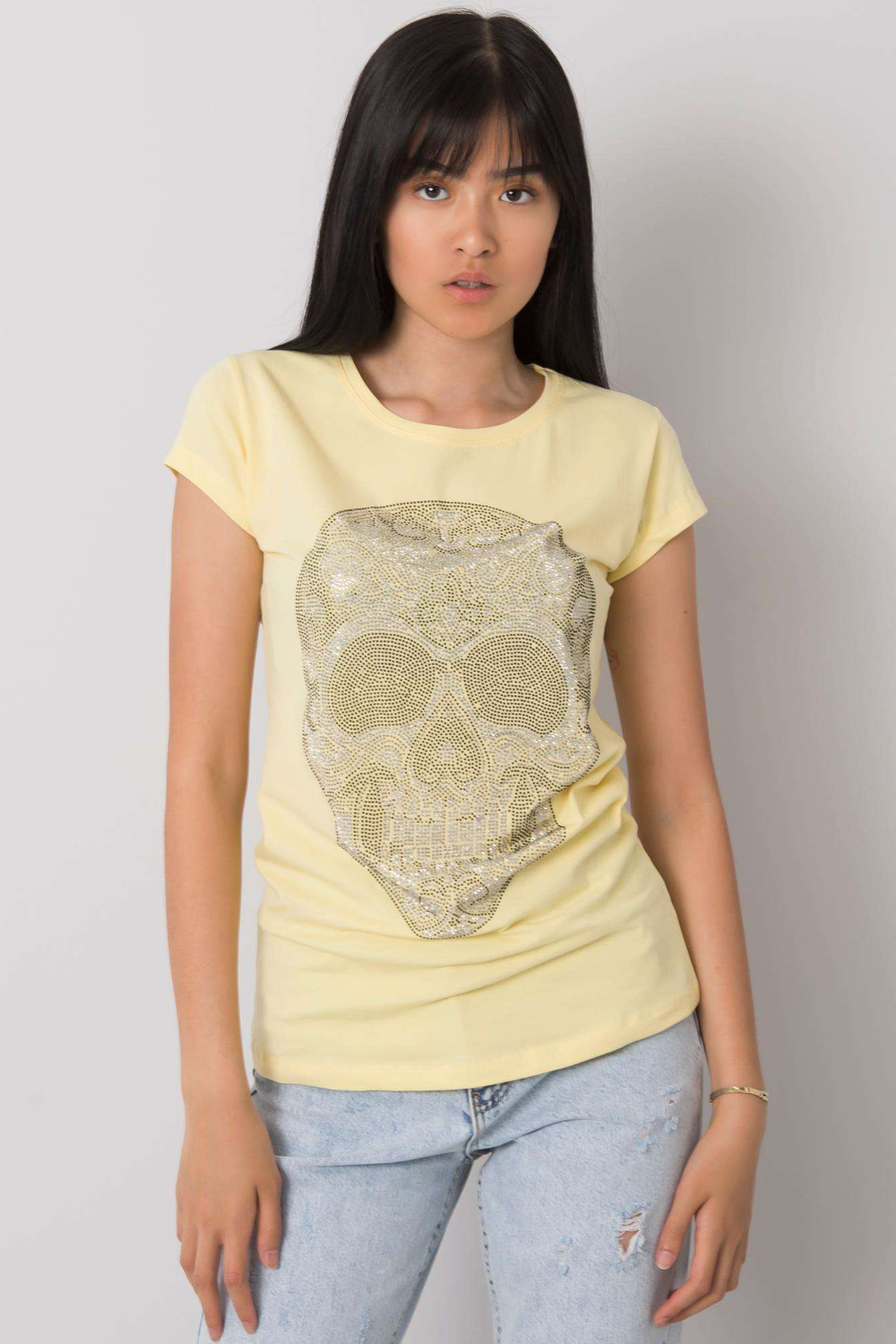 Šviesiai geltoni marškinėliai su kaukolės aplikacijomis.