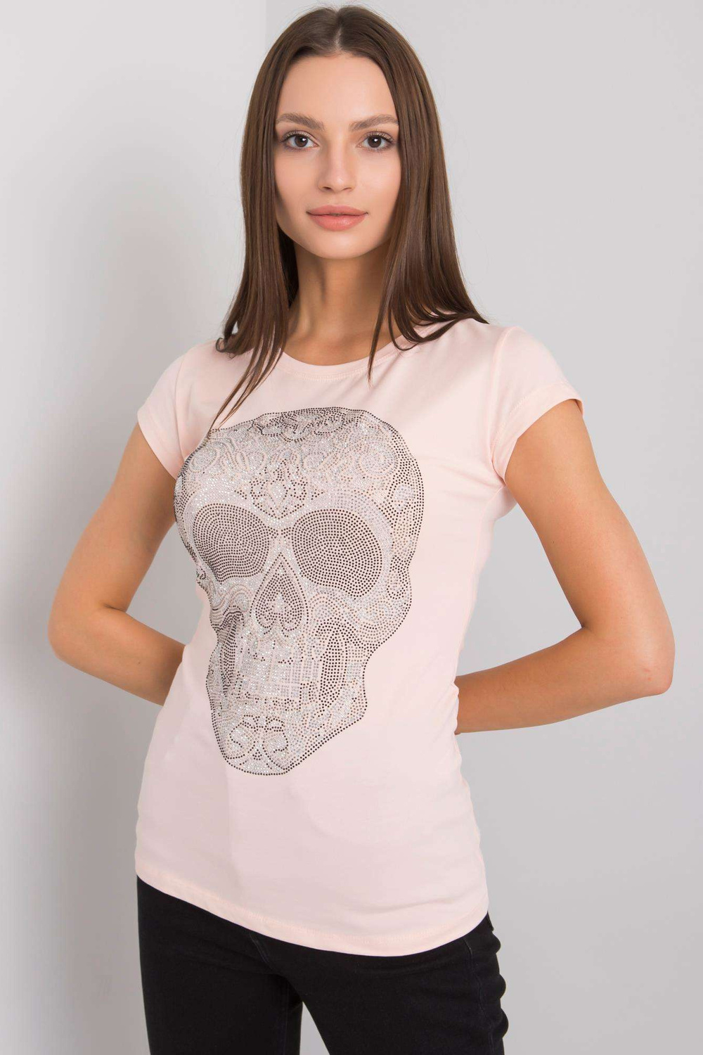 Šviesiai rausvi marškinėliai su kaukolės aplikacijomis.