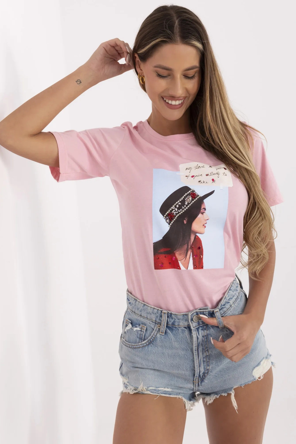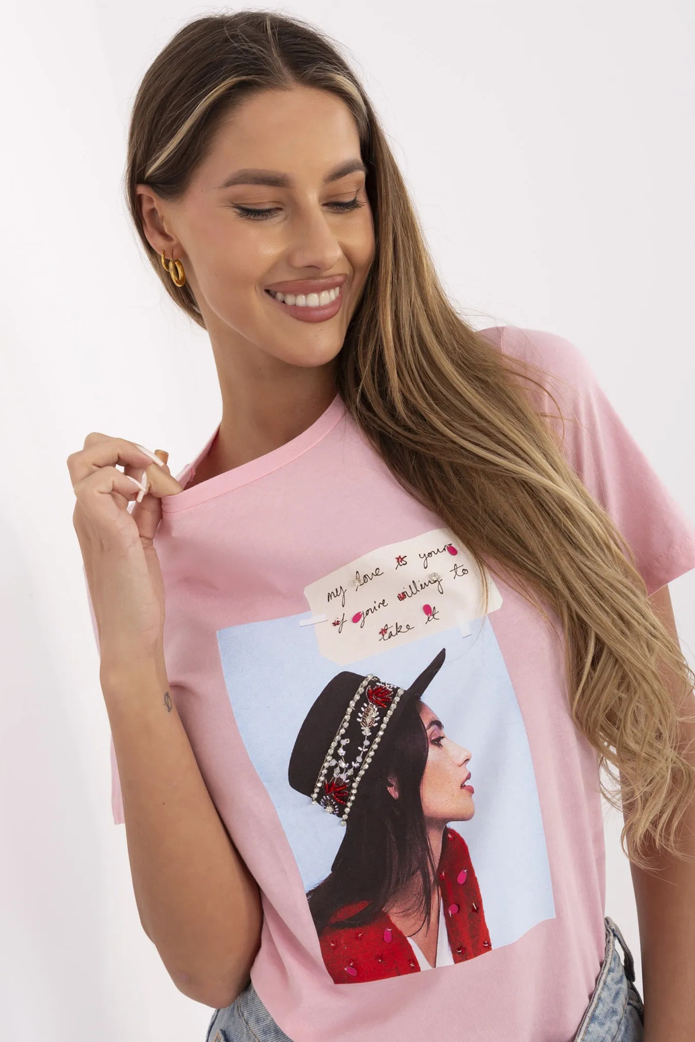 Rožiniai marškinėliai su šiaurine aplikacija.