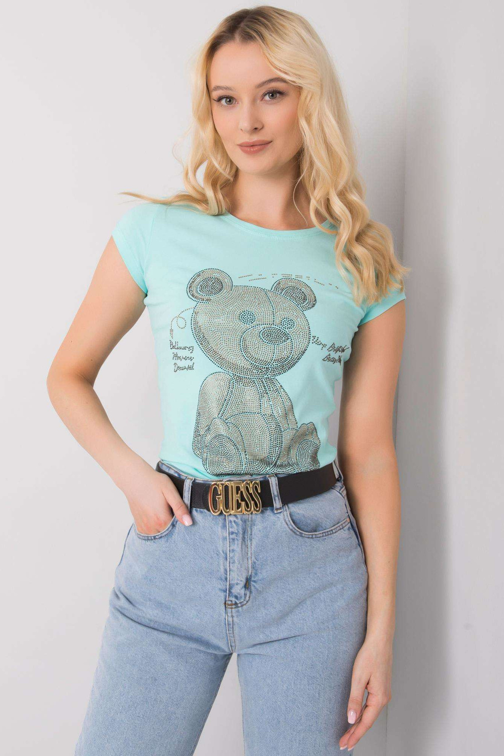 Mėtinės spalvos marškinėliai su Misha aplikacijomis.