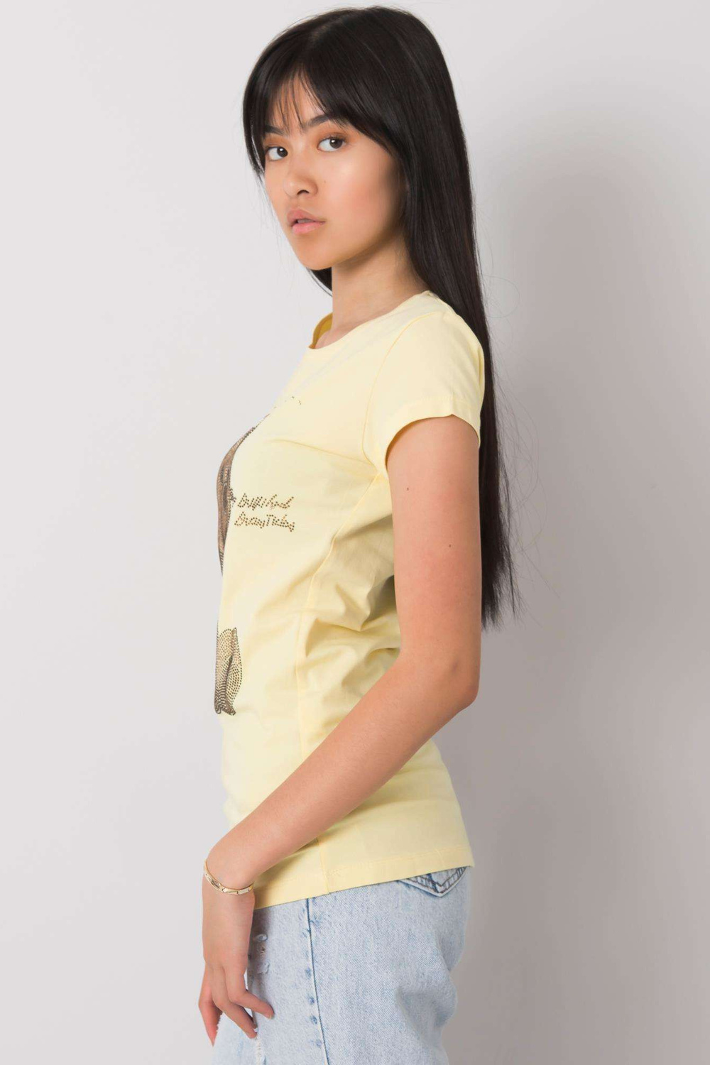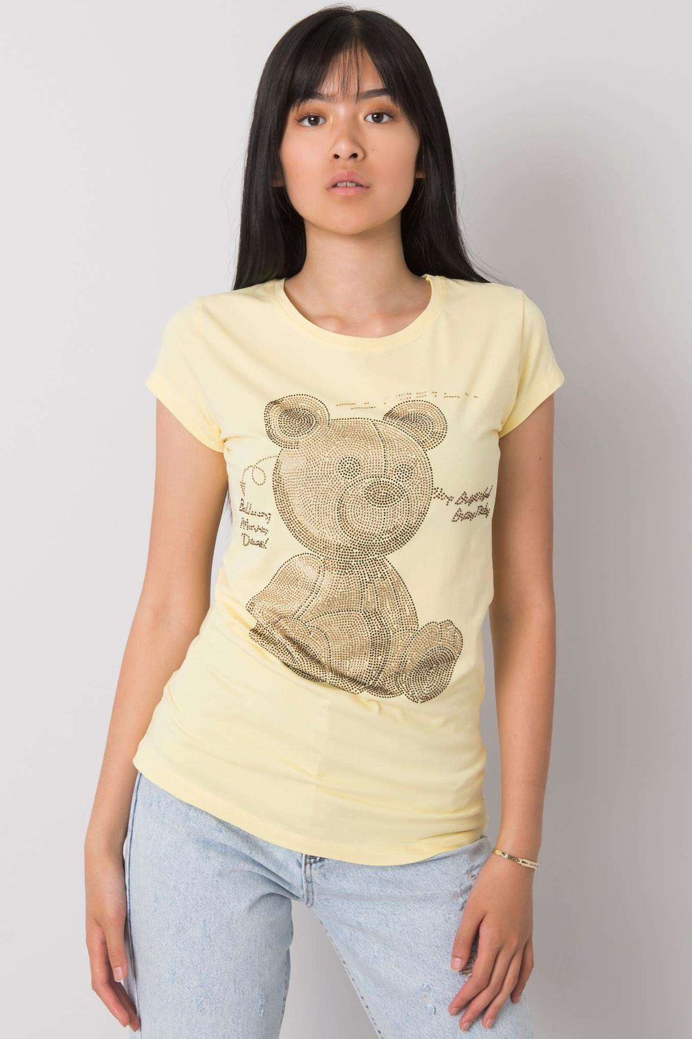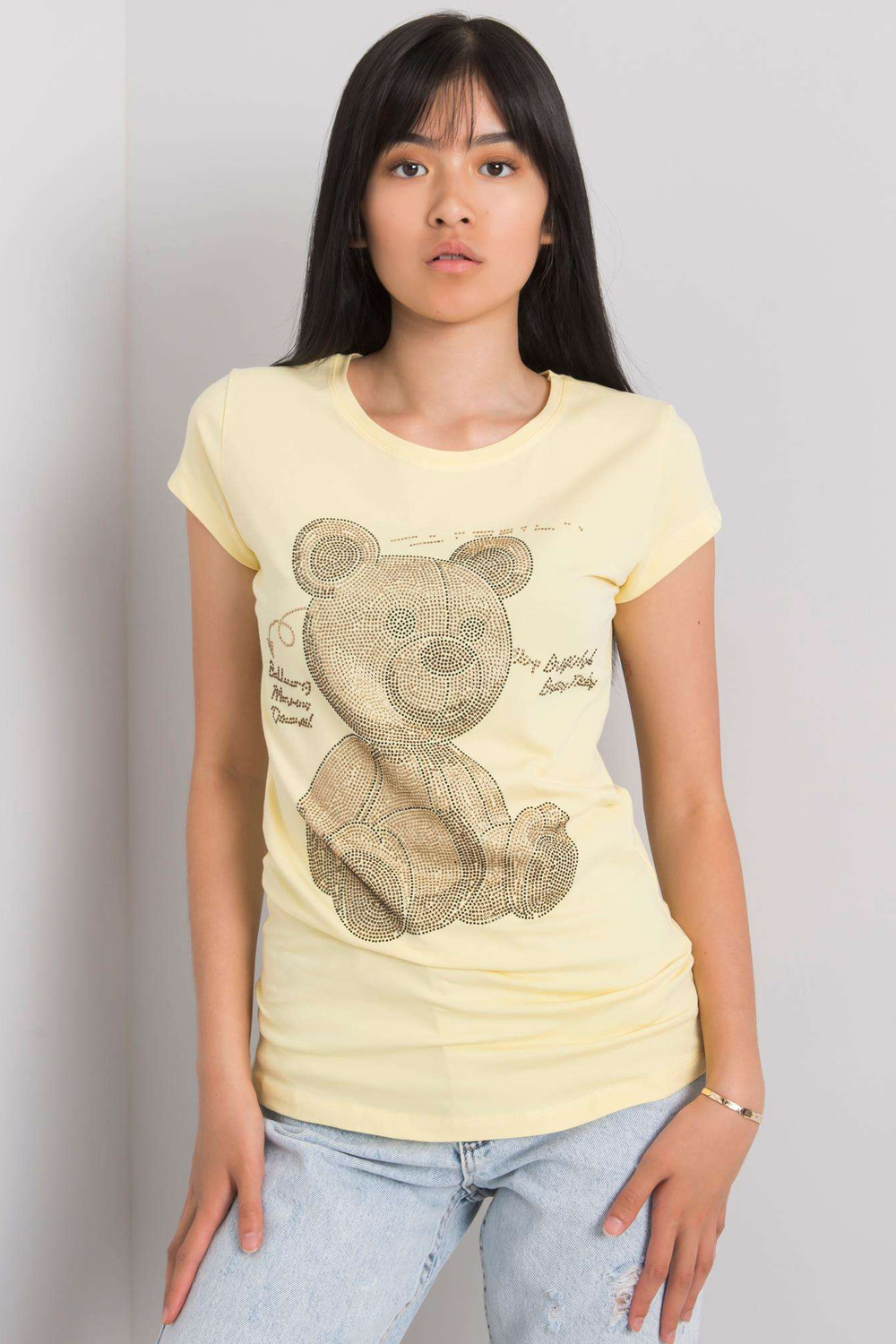 Šviesiai geltoni marškinėliai su Misha aplikacijomis.
