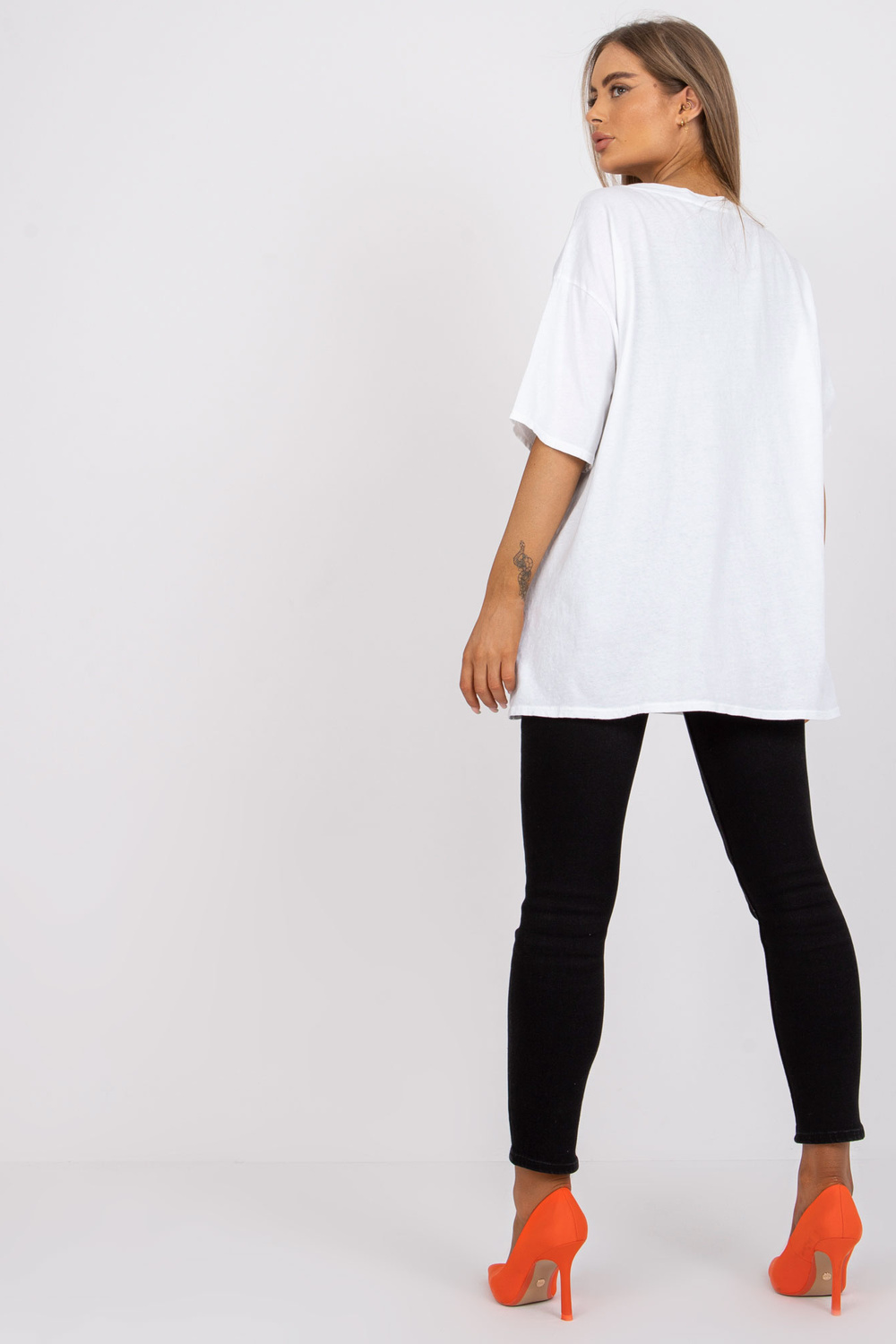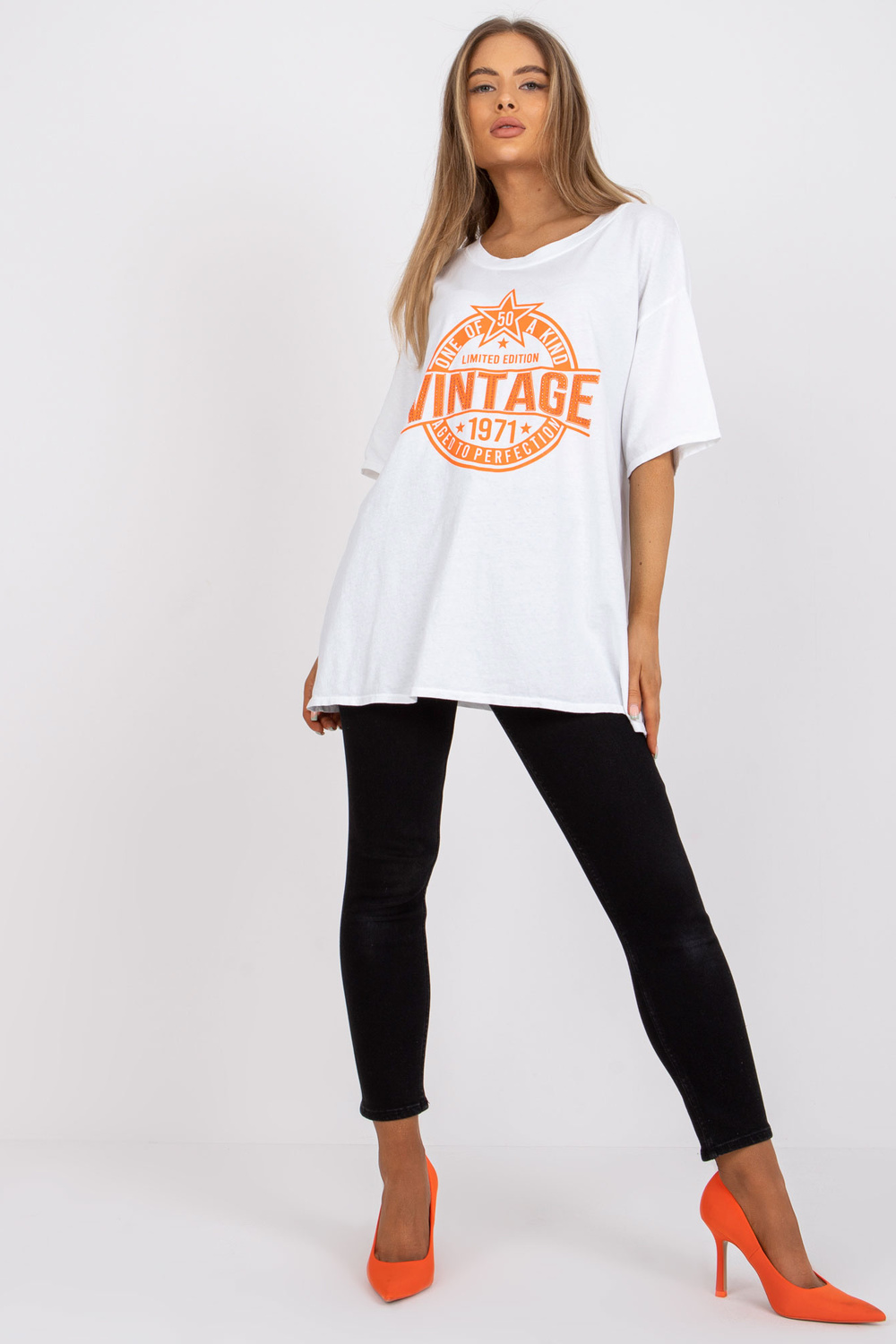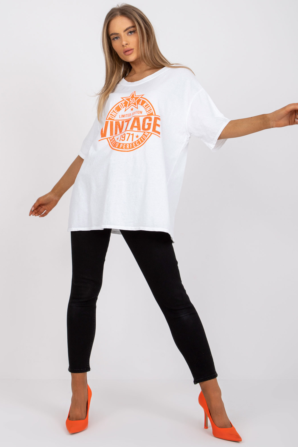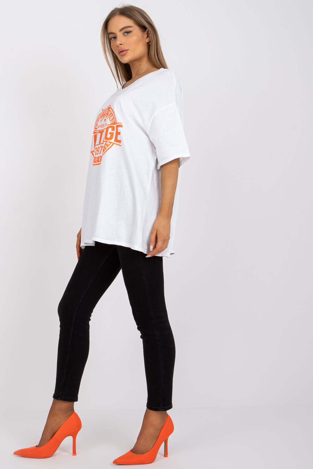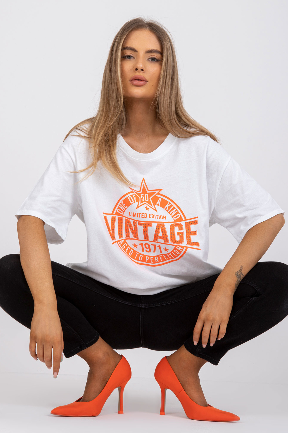 Balti ir oranžiniai medvilniniai marškinėliai su aplikacijomis.
