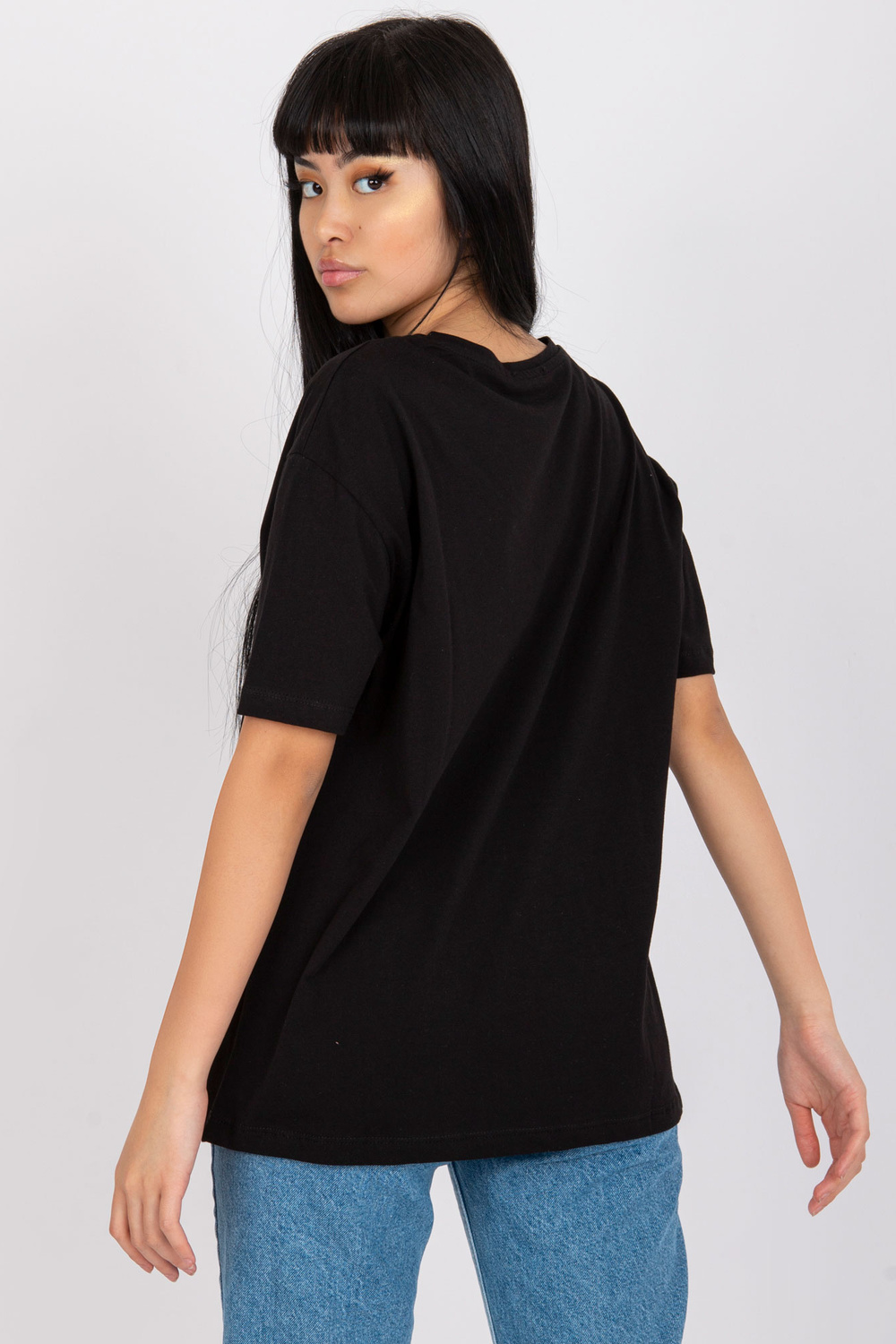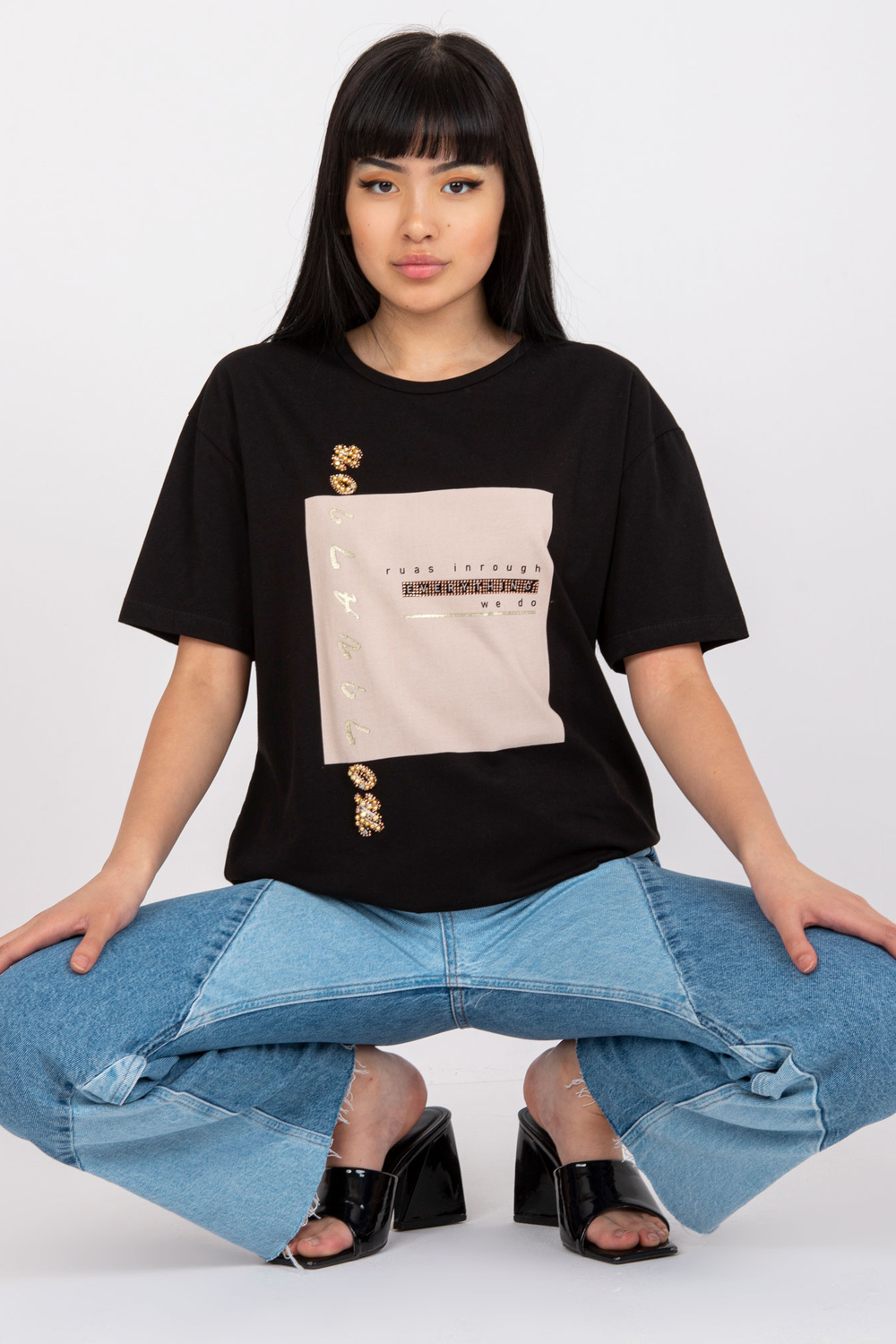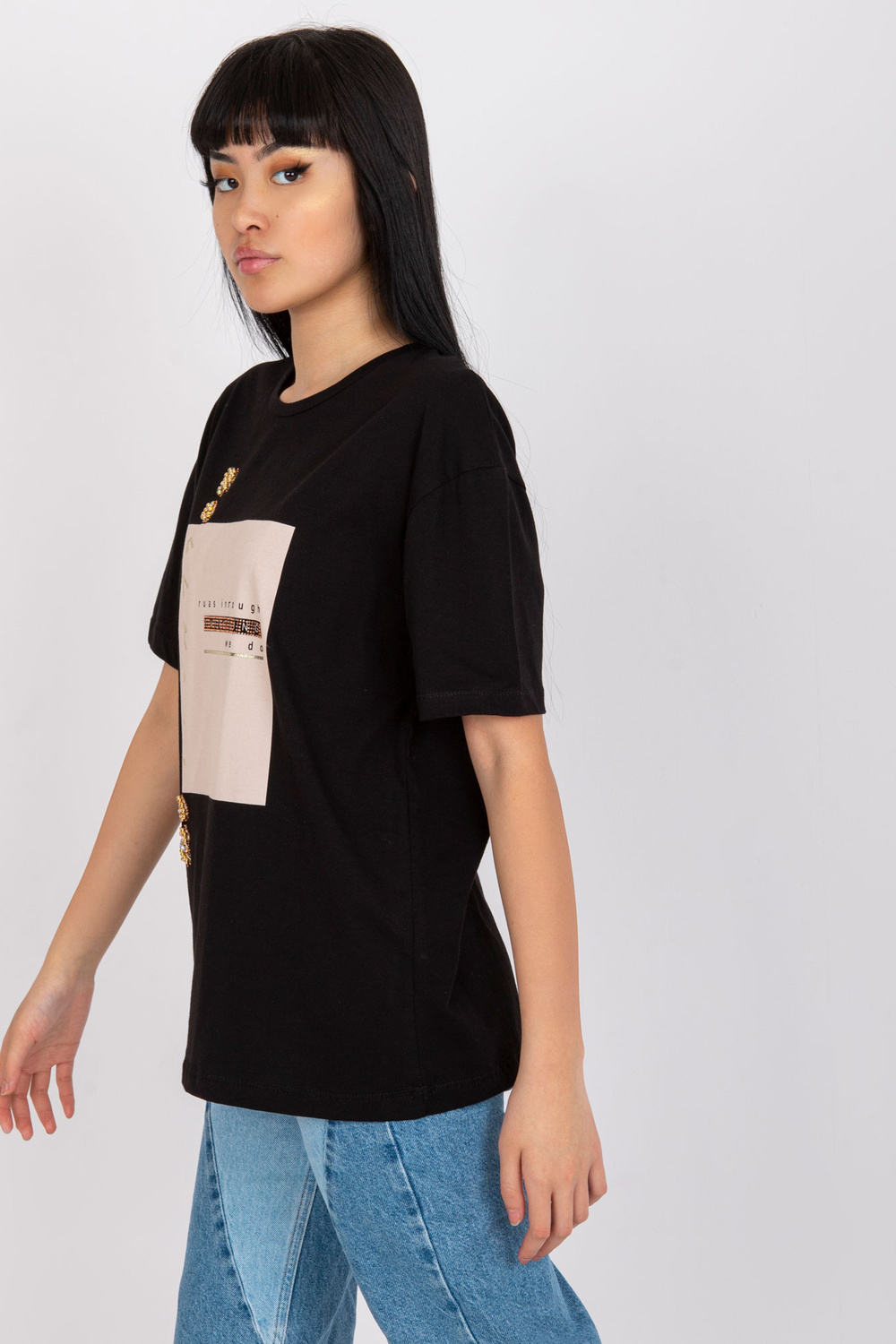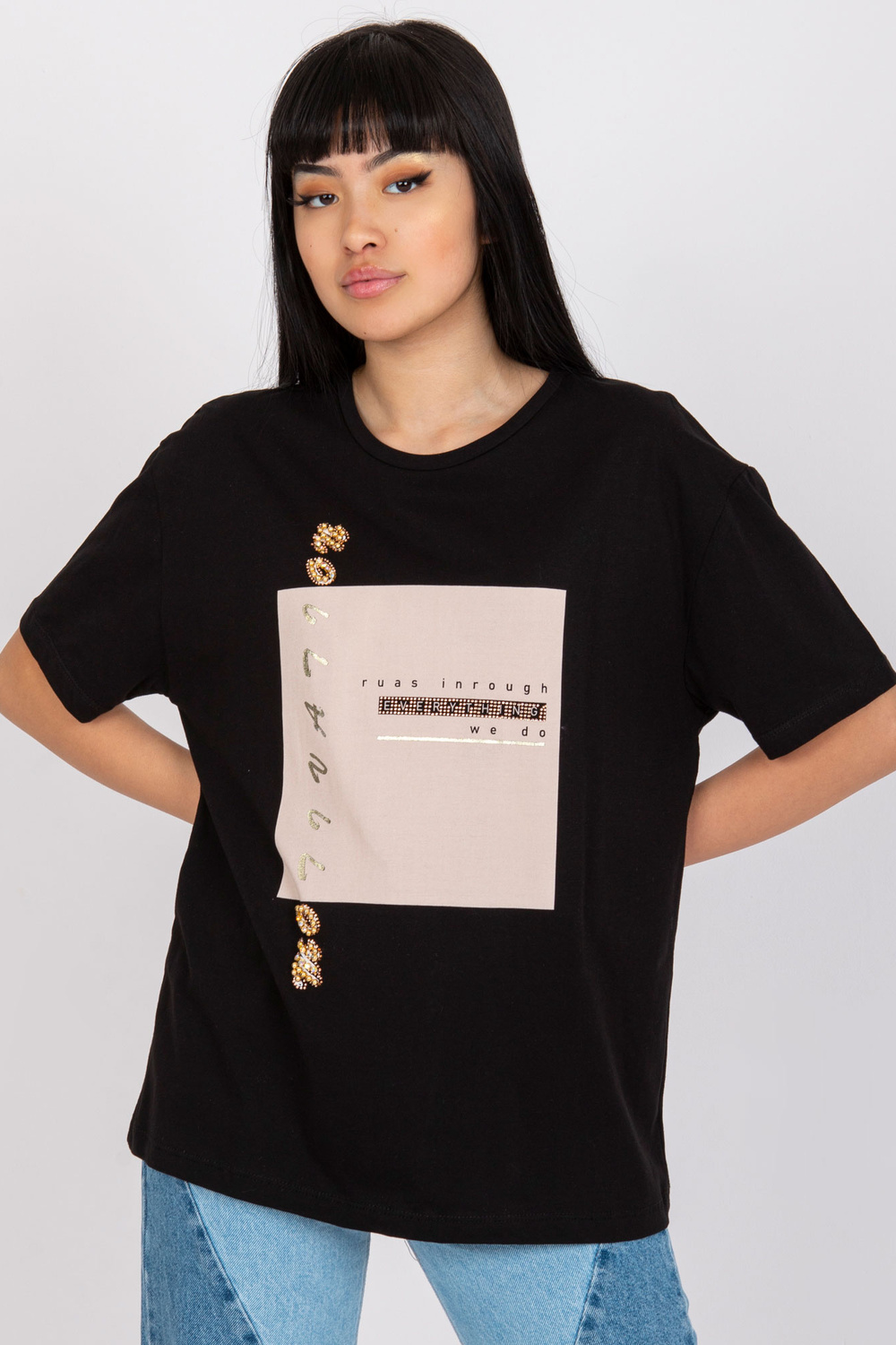 Juodos spalvos medvilniniai marškinėliai su aplikacijomis.
