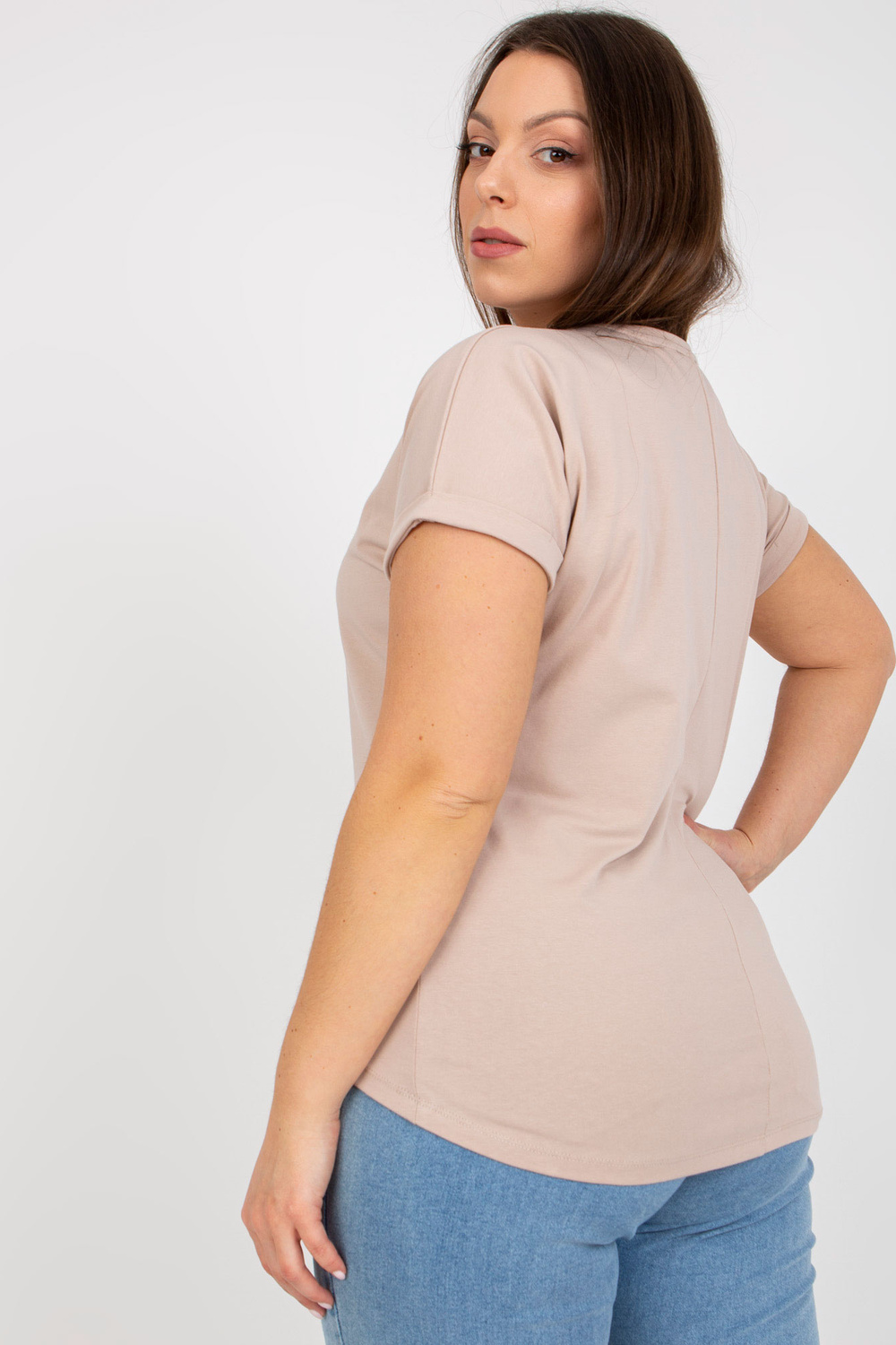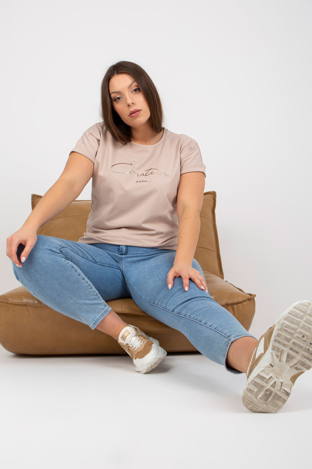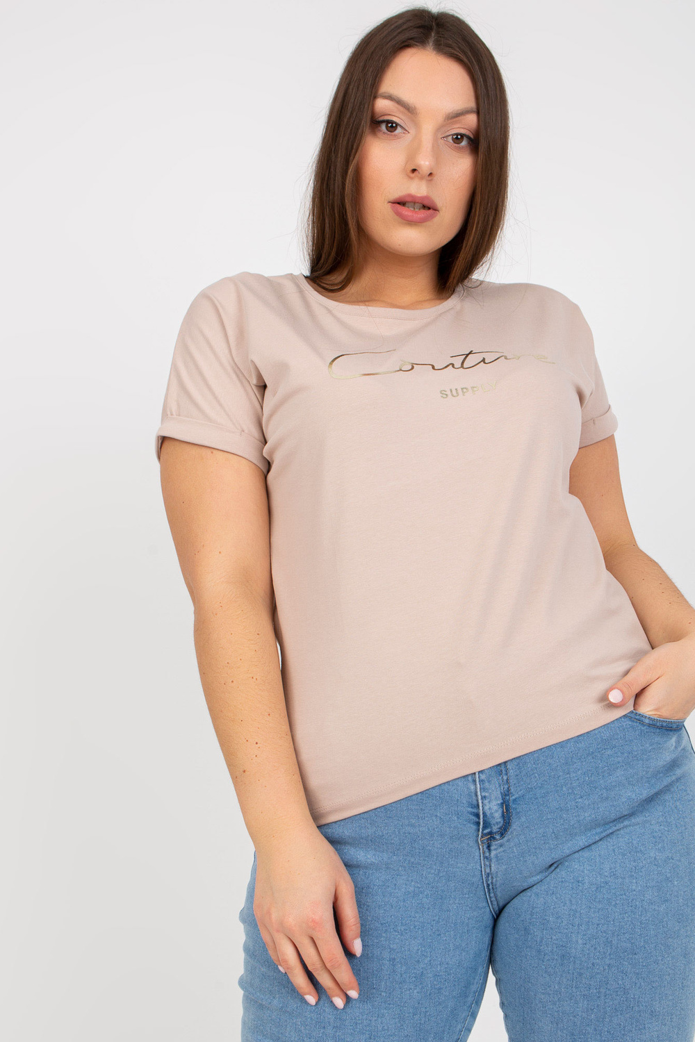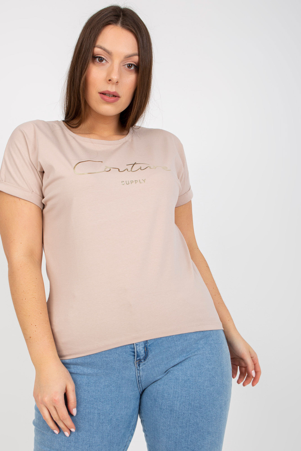 Beigeplus dydžio marškinėliai su aukso spalvos užrašais .